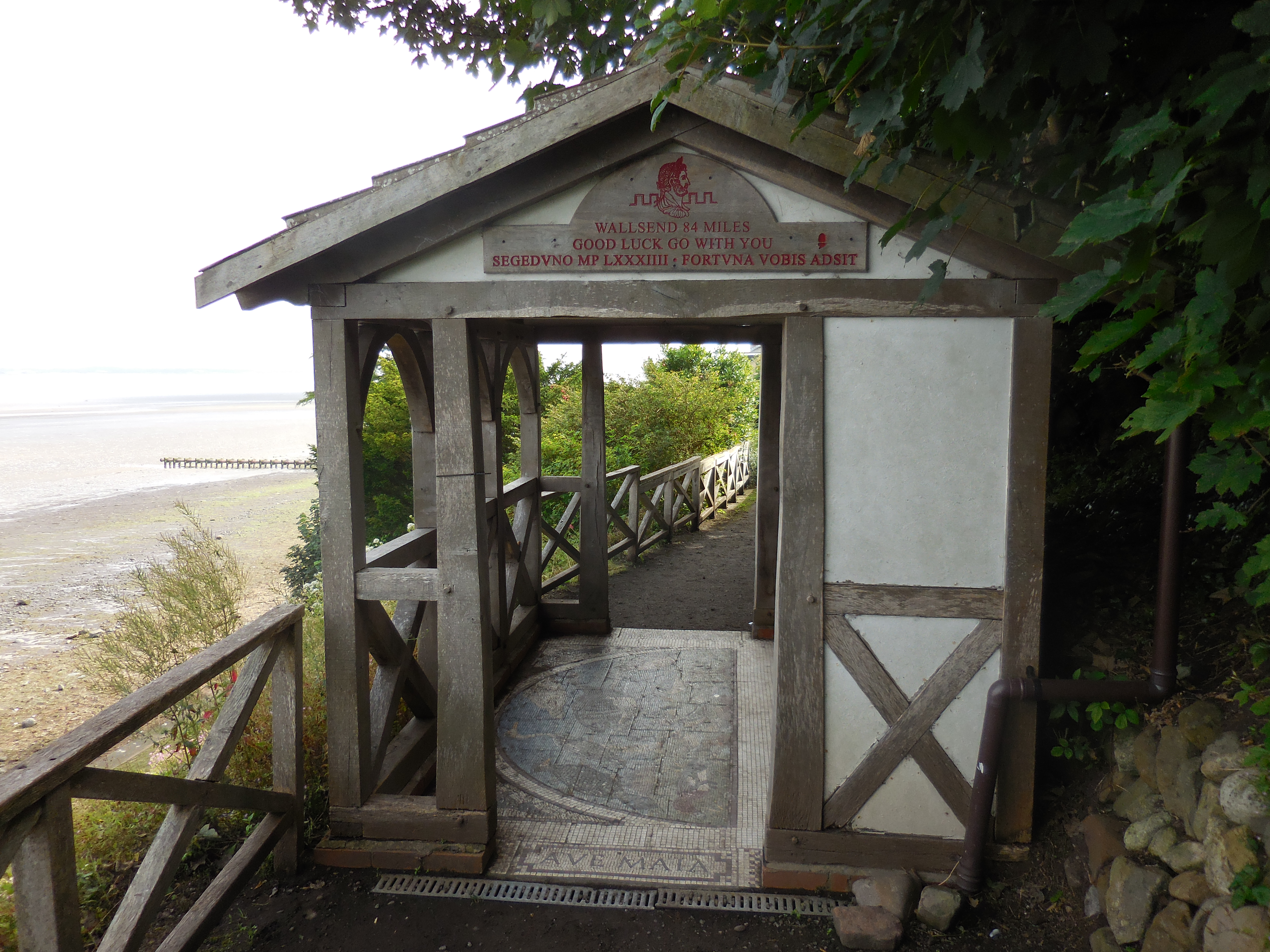 We all piled out of the bus at a corner and made our way down to the start/end point of the Path, marked by a covered bench overlooking the beach and with a lovely tiled floor. Naturally pics were taken, also we got our first stamp in our Hadrian’s Wall passport, which is a bit like a Credencial, only it doesn’t give you the right to stay anywhere, just the right to buy a special purple achievement badge if you have all seven stamps.