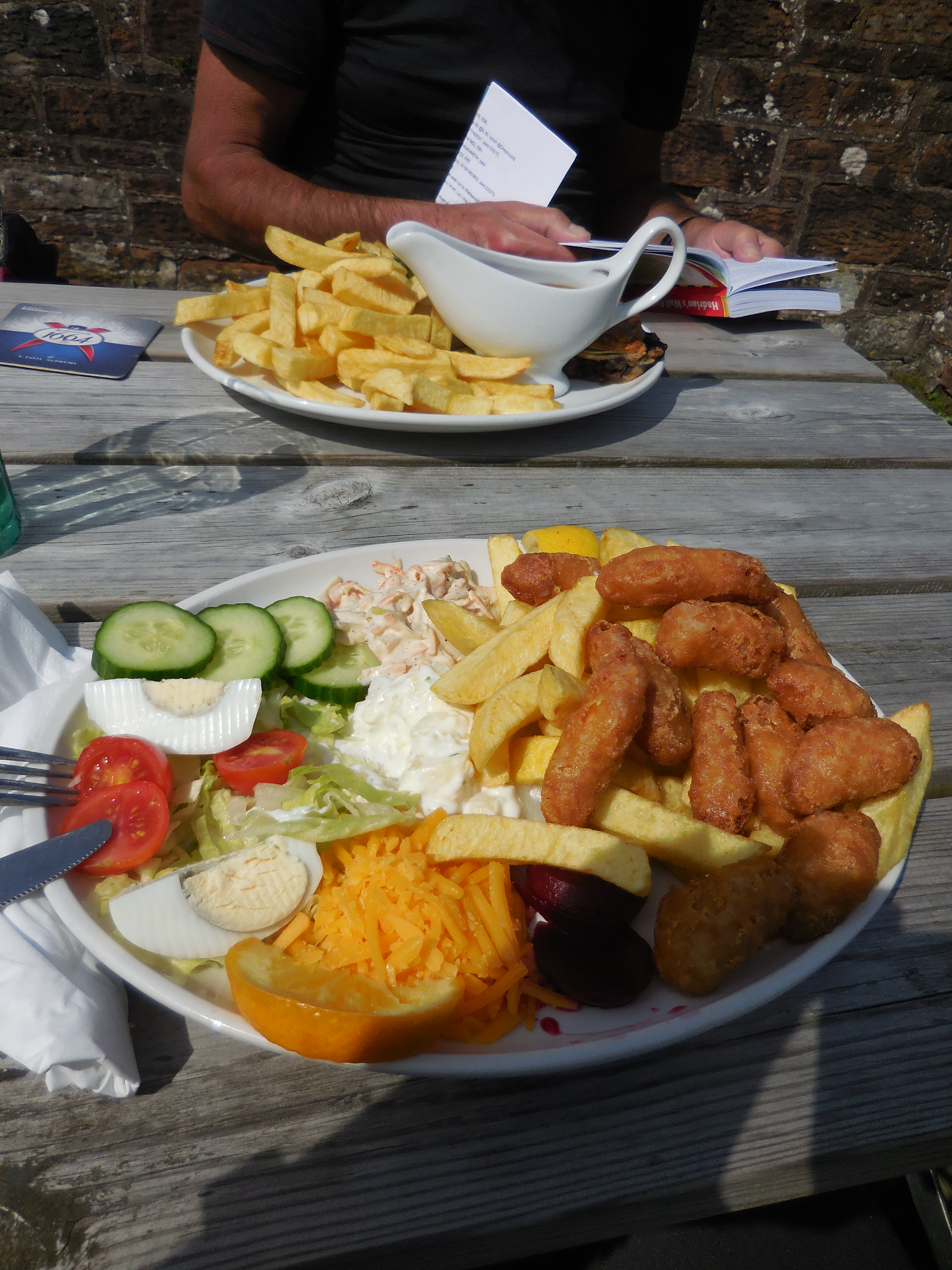 There was not only tarmac though, we walked on a gravel path in a wooded part, through fields and on an elevated path next to the road (we didn’t at first, thinking it was part of the wall structure, but someone told us it was the base for the old train line so then we did). Lunch was had at the Greyhound pub, which was a very welcome sight by the time we got there. Turns out we didn’t have enough water anyway and a pint went down really well with the oddest salad I have ever had – hard boiled eggs, potato salad, coleslaw, grated cheese, beetroot, tomato, cucumber, lettuce and a slice of orange(?). But the Whitby scampi were just perfect in the sunshine.