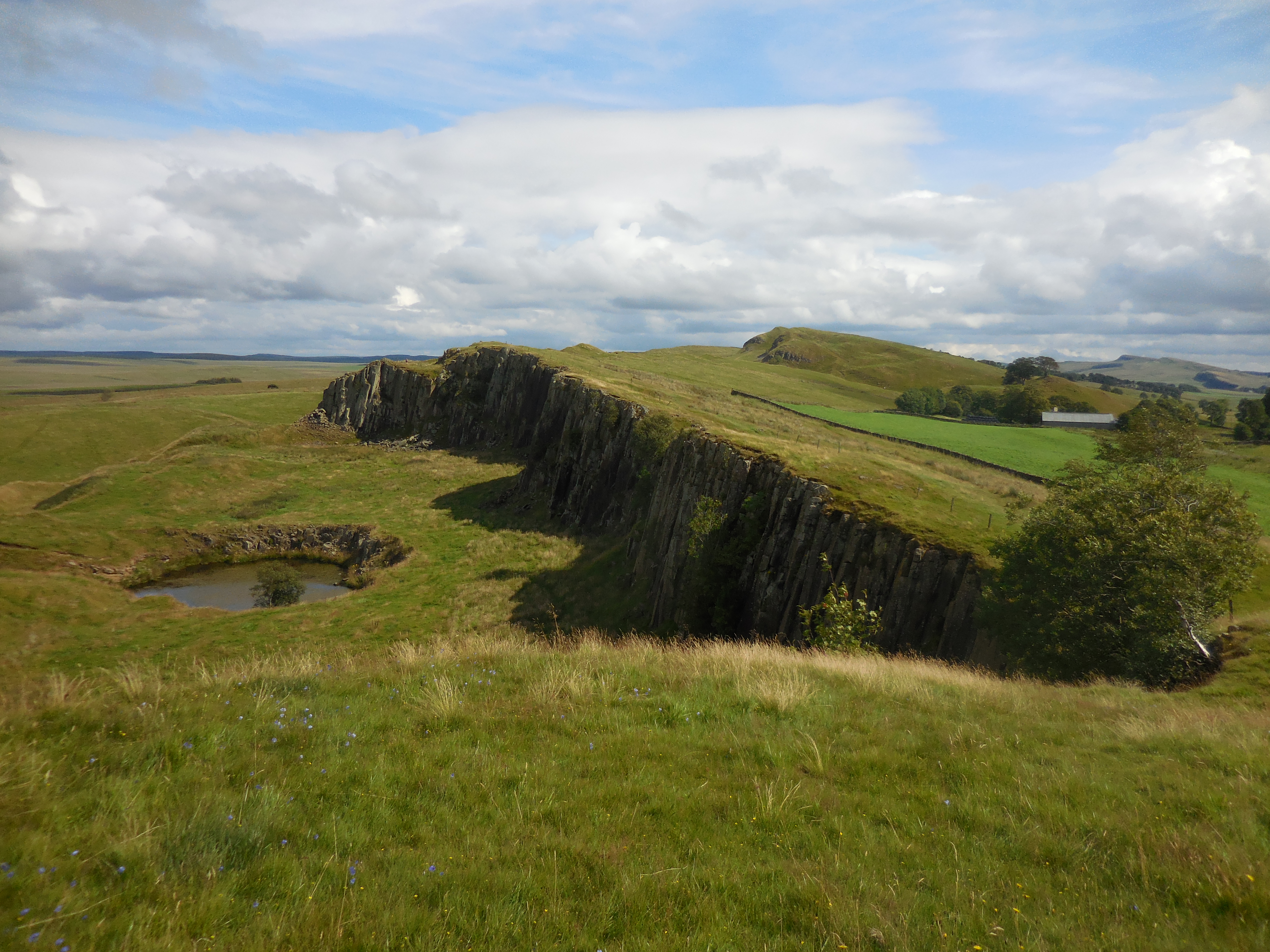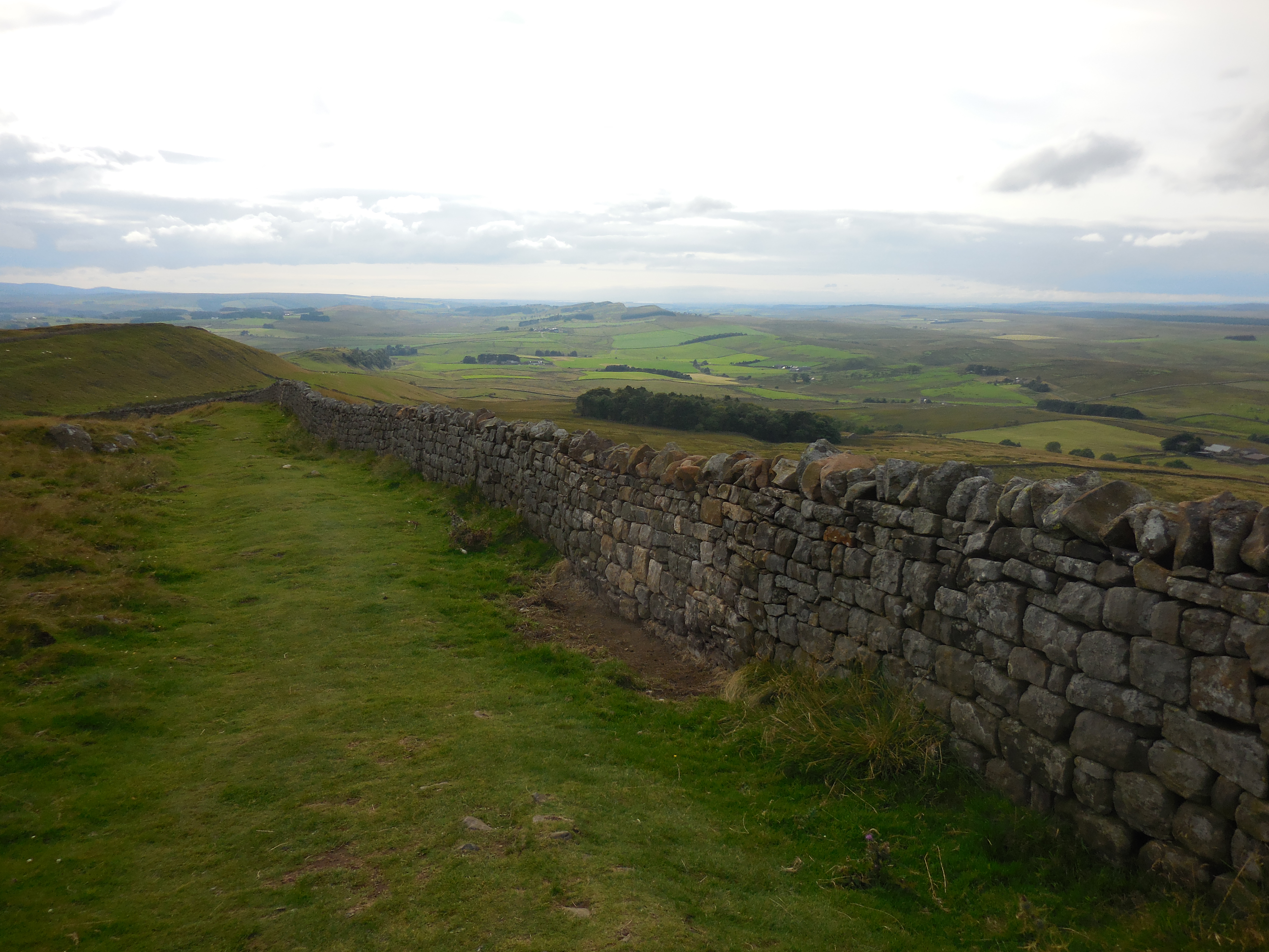 Finally the famous crags, with the Wall snaking along the edge in an incredible feat of human engineering. Camera at the ready we powered up there and were rewarded with the kind of views we came here for. The sun even lit the scene. Breathtaking, and not just because of the steep hill. We stopped, turned, looked out over the landscape which was suddenly like a huge patchwork below us, our eyes trailing the wall behind and in front of us. The wind kept us cool and it was a really comfortable and exhilarating walk up and down, on grass and paths and stepping stones laid along the wall. Wouldn’t like to think what it must be like in heavy rain, or after rain, it must be muddy and slippy. Our walking shoes served us very well though and it wasn’t too challenging, just a beautiful and ever changing walk with amazing views and perfect weather.