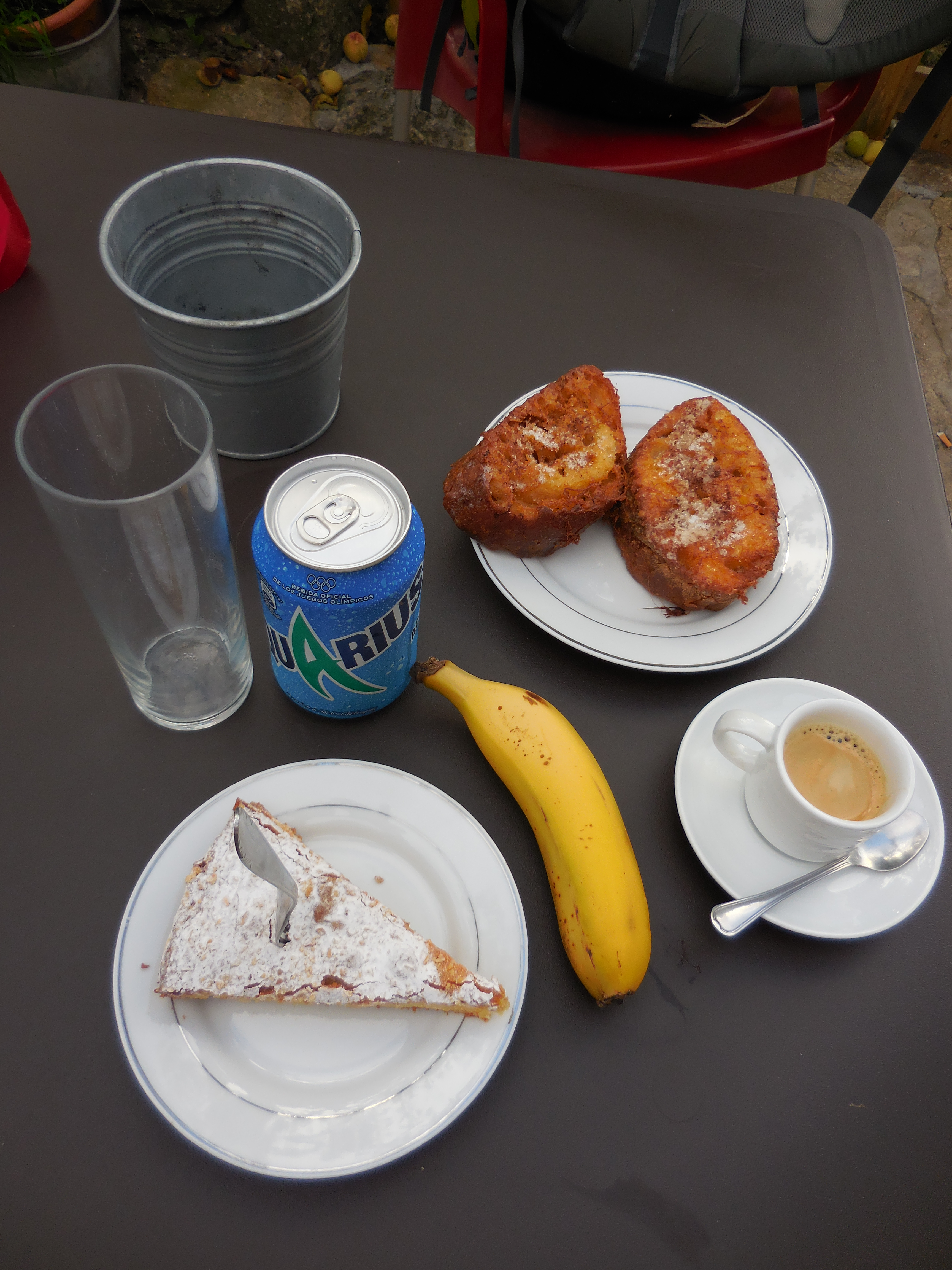 I suppose breakfast (and second breakfast) are important enough to view again and again. Note the very greasy, very crispy, very sweet and very cinnamonny French toasty thing, which was apparently delicious. I stuck to the Santiago cake and banana. Oh and Aquarius, obviously.