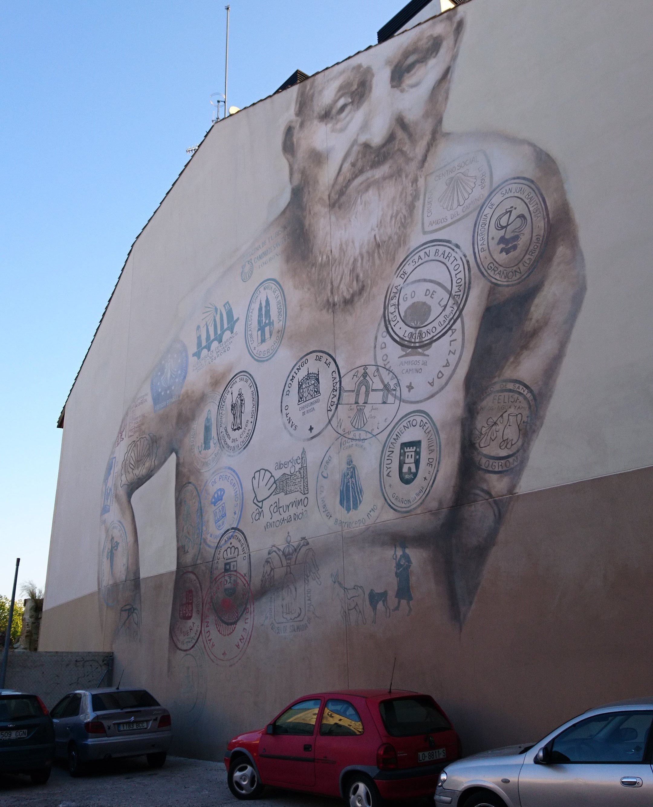 The camino basically follows the motorway from Navarrete, and it was another dry, dusty, hothothot walk with no shade. Luckily we had filled our water bottles and also one of the water bags, but it was scorching and we also had to cover up and wet our necks and heads at regular intervals. It was like walking through treacle! Italian cyclist Pascuale stopped with us under a bridge and offered us energy bars and drinks which we were very grateful for. The last km was really hard work, but we got there.
