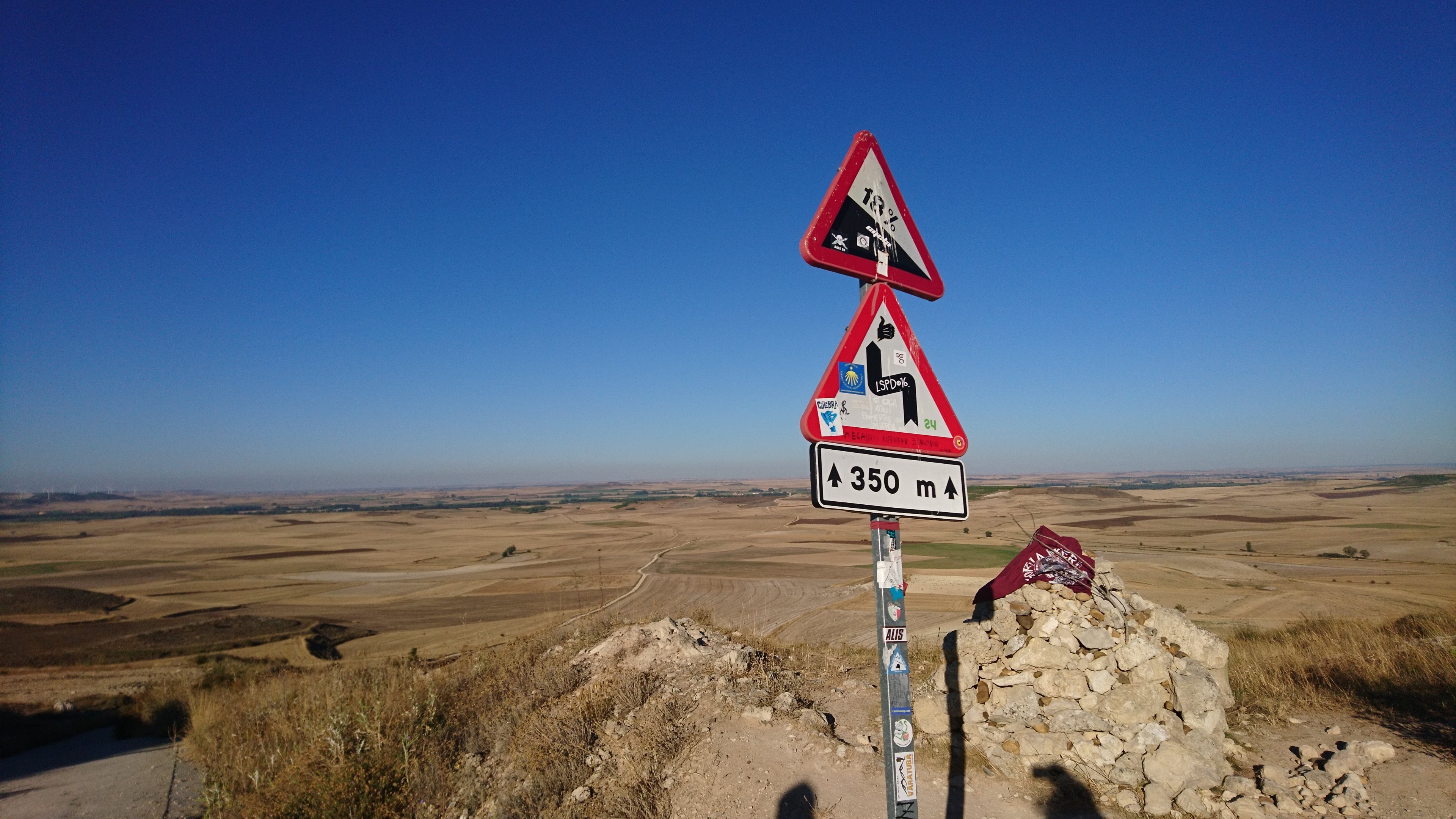 The descent is equally steep, 18% according to the sign. I was so glad I had my Pacerpoles as handbrakes! My knees felt it but again, the view was stunning. The sky is huge on the meseta, and I was happy that it was sunny, even if it was too hot for my liking, because I still preferred it to wind and rain and mud.