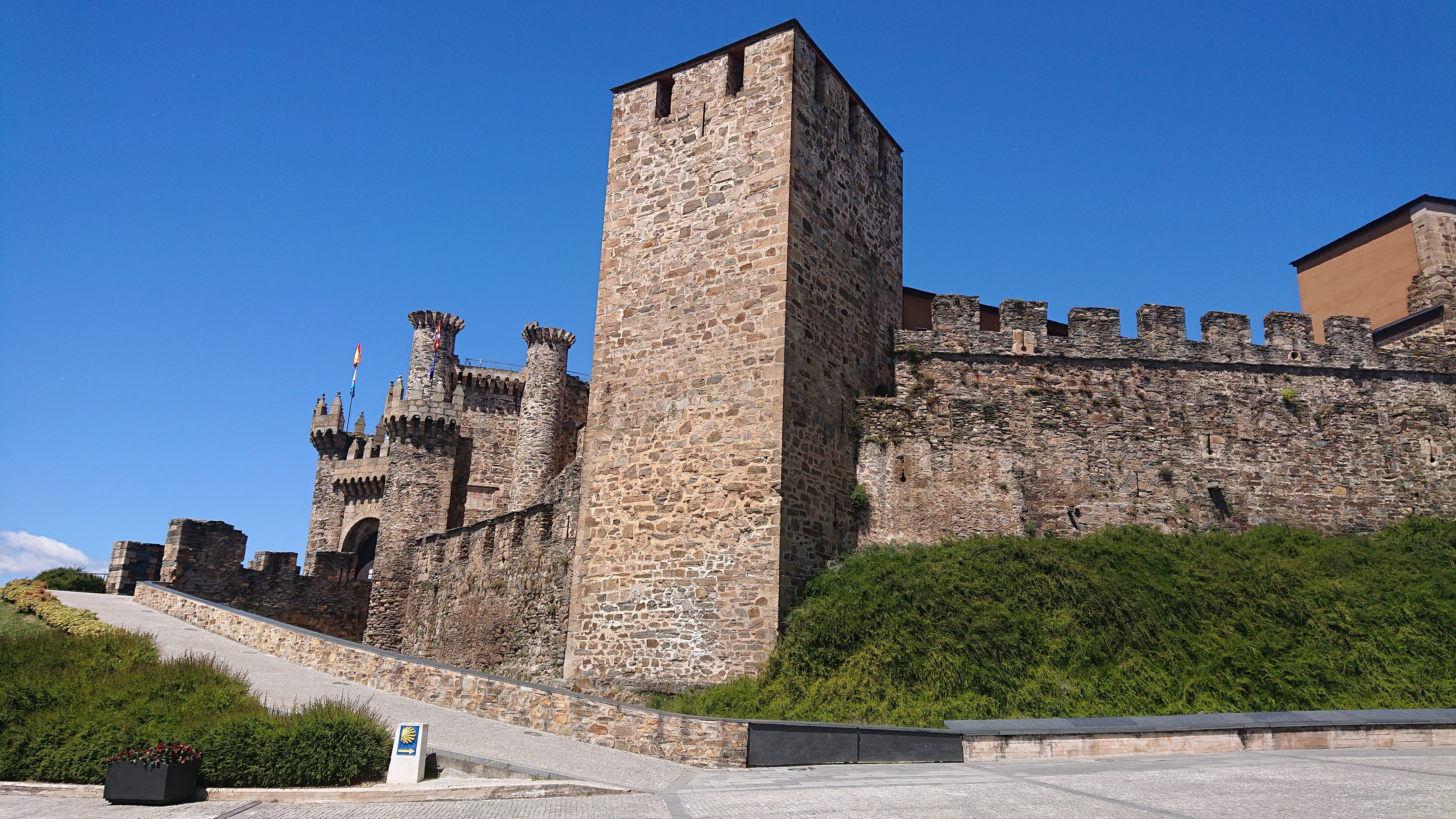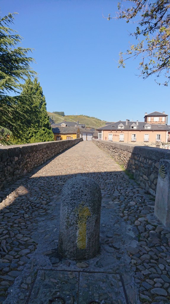 When I got to Molinaseca, it was time for a light lunch. Normally pilgrims congregate in the two main bars/restaurants by the river and sit there and enjoy the sun and a well deserved refreshment while they watch out for friends coming down from the steep trail. I didn’t really know anyone, but the place was full so I asked if I could sit with two ladies my age-ish. They were Irish and Australian, arrived separately and now walking together, which so often happens. I could easily have stayed there a good long while rather than start on the boring concrete slog into Ponferrada, but luckily (?) a large group of Spanish cyclists, older than me – old enough to know better – descended on the outside seats with their music blasting out. Time to go.