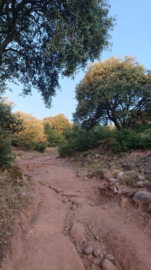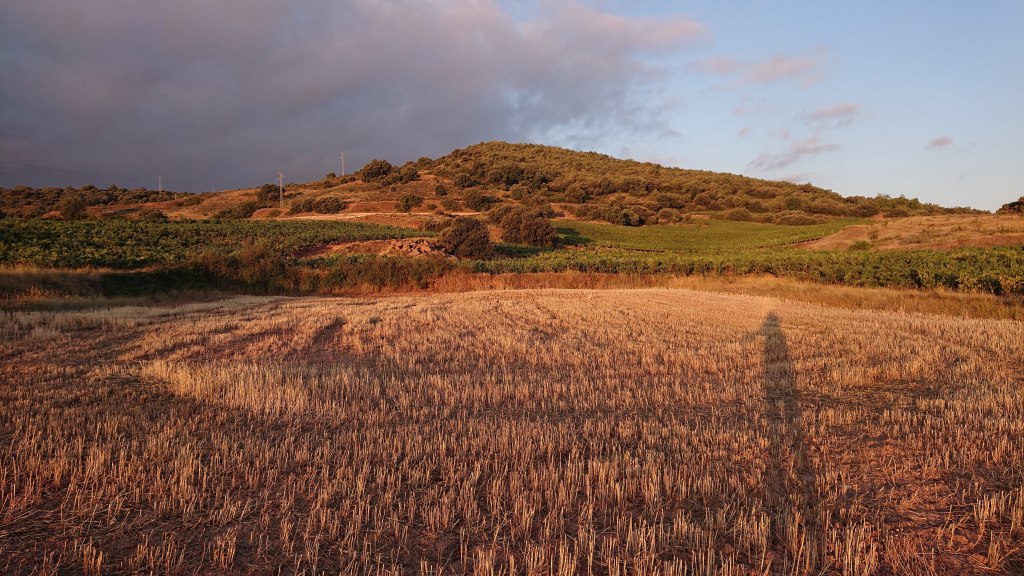 Ah, waking up in an albergue with lots of people all trying to get ready at the same time – it is something else. And this time I knew none of them … and instead of barging in I took my time – I was in no hurry. By the time I was good to go, the crowds had thinned out in the nearest bar, so I got a table to sit down and have my camino breakfast of café con leche, Aquarius and a croissanty thing. Then off into the gorgeous still-early morning’s golden light and rolling landcapes.