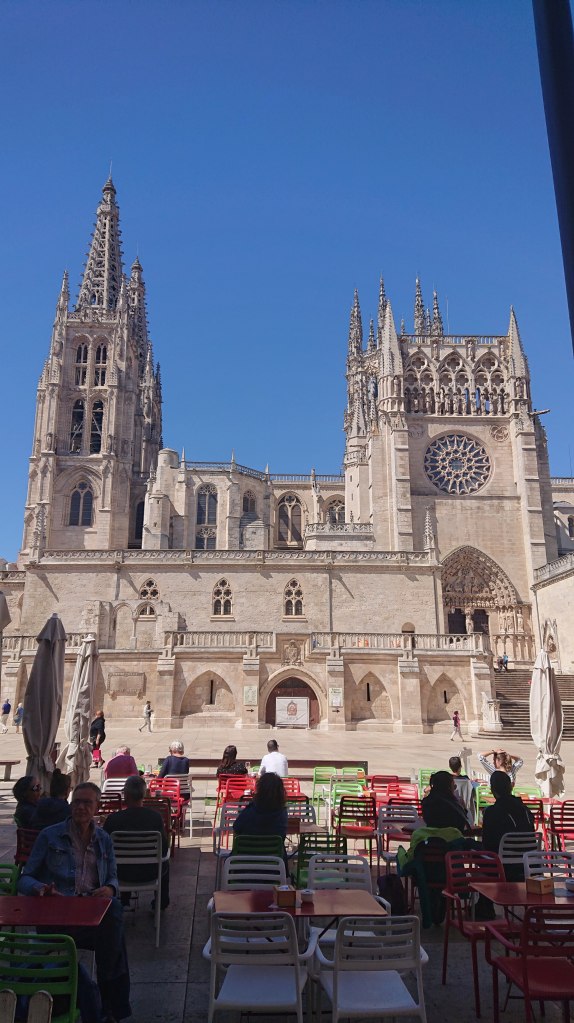 Then we decided to have a rest and some refreshments before going to see the cathedral, and she mentioned she needed a warmer top for the meseta which lay ahead, so we tried to find the bus that would take us to Decathlon – but failed miserably. After trudging around, waiting in the hot sun and doing some unplanned (but good) sightseeing, we gave up and then promptly found a fleece top in a china bazaar at a fraction of the price! Job done, we went to take another break and watch the cathedral from the outside before going in.