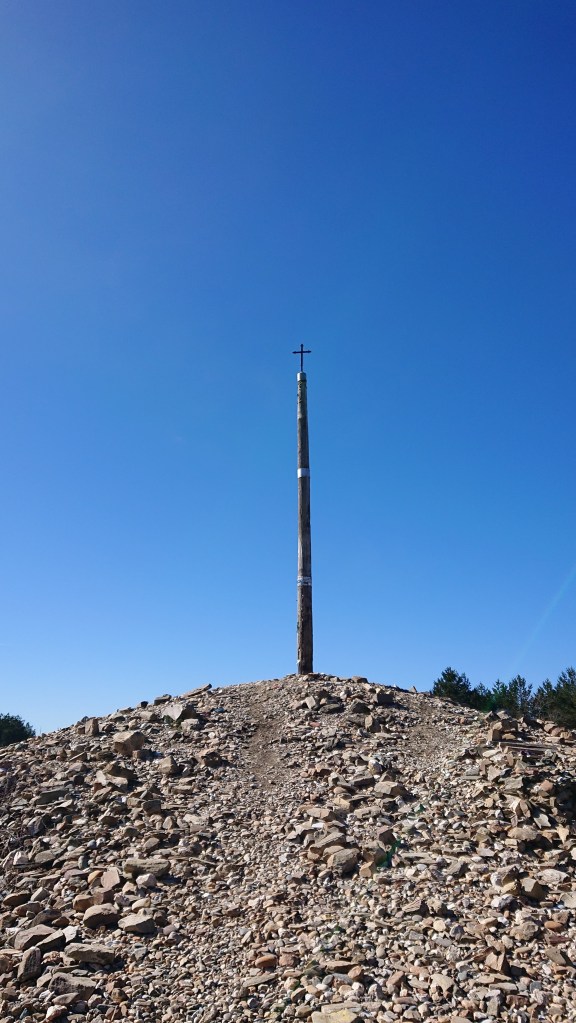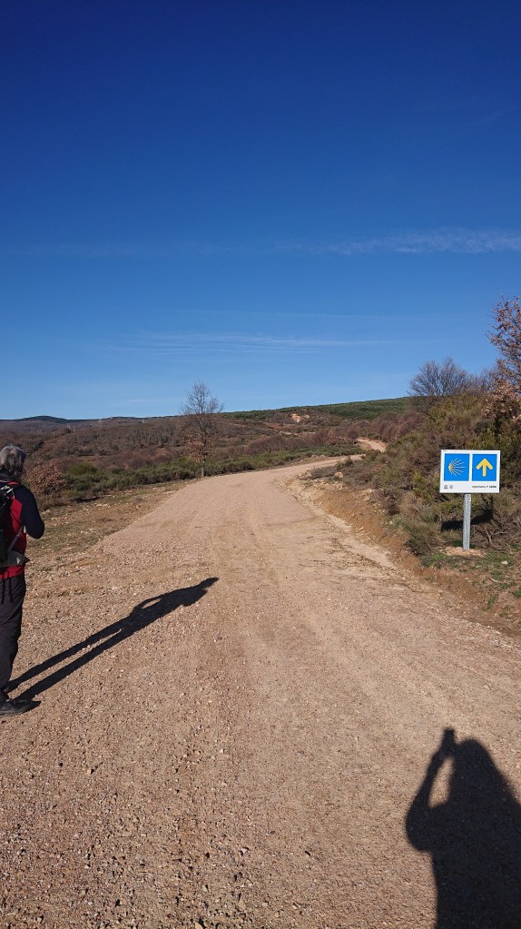 Then on we walked in the brilliant sunshine under a cloudless sky. Magic. We hadn’t seen another walking pilgrim so far, but fully expected to run into a busload or two by the Cruz de Ferro, the Iron Cross. But – not a soul! I took lots of photos, I’ll probably never see it like this again. (Doubly so as apparently there are plans to redesign the whole area for Holy Year.)