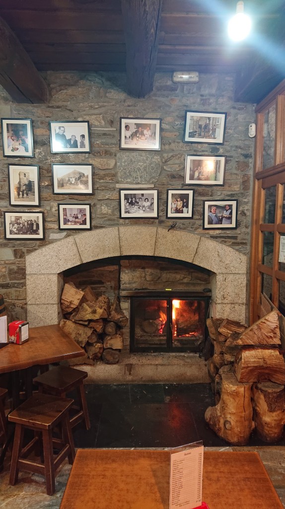 After the meal we checked in, did some laundry, had a rest, and then went back later to top up with some soup – both kinds, garlic and caldo gallego, for comparison – and a quiet time in front of the fireplace. There were a few other pilgrims, one of them seemed to be French and had a donkey with him. From what I could hear him saying to some of the others, he was planning on sleeping in the porch of the church … The evening was getting really bitterly cold and I hope I heard that wrong!