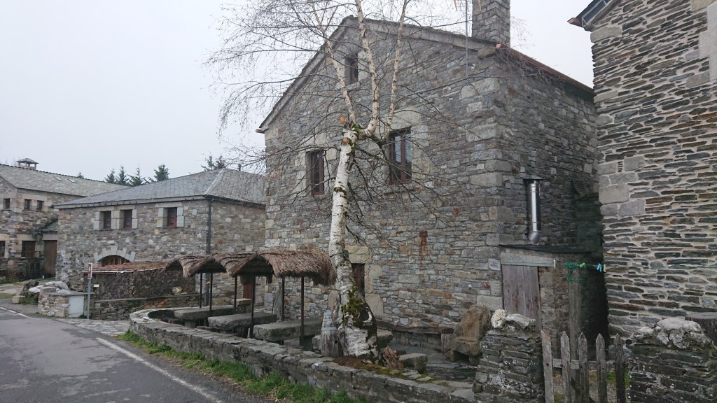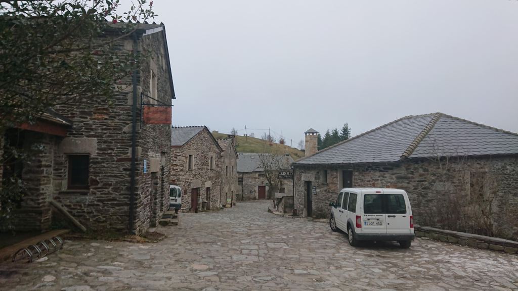 Then we carried on to Herrerias, where the cold and damp hung like a clammy curtain over the village. Hopefully the last bar would be open – yes, the one opposite the washing machine – and as we approached it a man came out. Yay! Only not so yay, because the poster on the door said it was closed for redecorating. As we stood there, a car came driving up and stopped right next to us. It was the taxi driver from the day before, come to see his uncle, who was doing the redecorating! We started talking and got an update about the carnaval (wet and cold), the bar (wet paint) and the washing machine (no hope). Then he asked about the ankle and said he was going up to O Cebreiro anyway, so we could have a lift at half price. We’d only walked 6 km but there would be no place to stop for the next 8, and they would be steep. After a short pow-wow we decided to go for it.