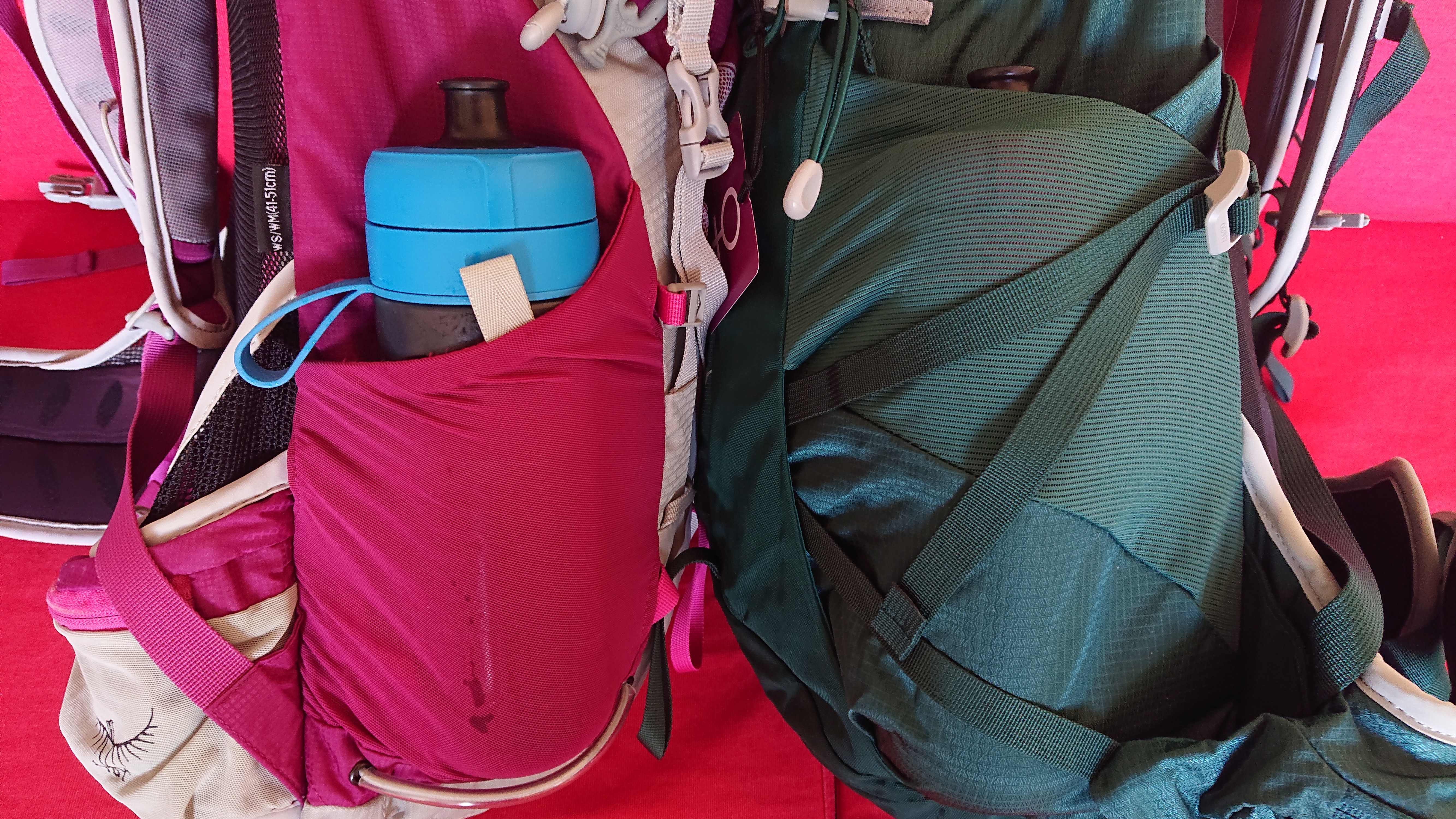 Pockets: There is still one mesh pocket either side and one on the front, but the side ones are now much deeper, seem wider and are reinforced with sturdier material at the bottom to avoid ripping. Great if you like deep and safe side pockets, but it also means I won’t be able to reach my water bottle on the move, drink and replace it without stopping or asking anyone for help. There is also a reservoir/bladder pocket on the back if you use these, but I don’t and won’t, I want to see how much I have left and top up my bottle quickly and easily. So great pockets, though not necessarily for my use. In the photo below you can see how two identical water bottles fare in the pockets – the T34 pockets swallow it completely! There are also pockets on the hipbelt, one on the left shoulder strap, one on the bucket lid and a mesh one just inside the opening.