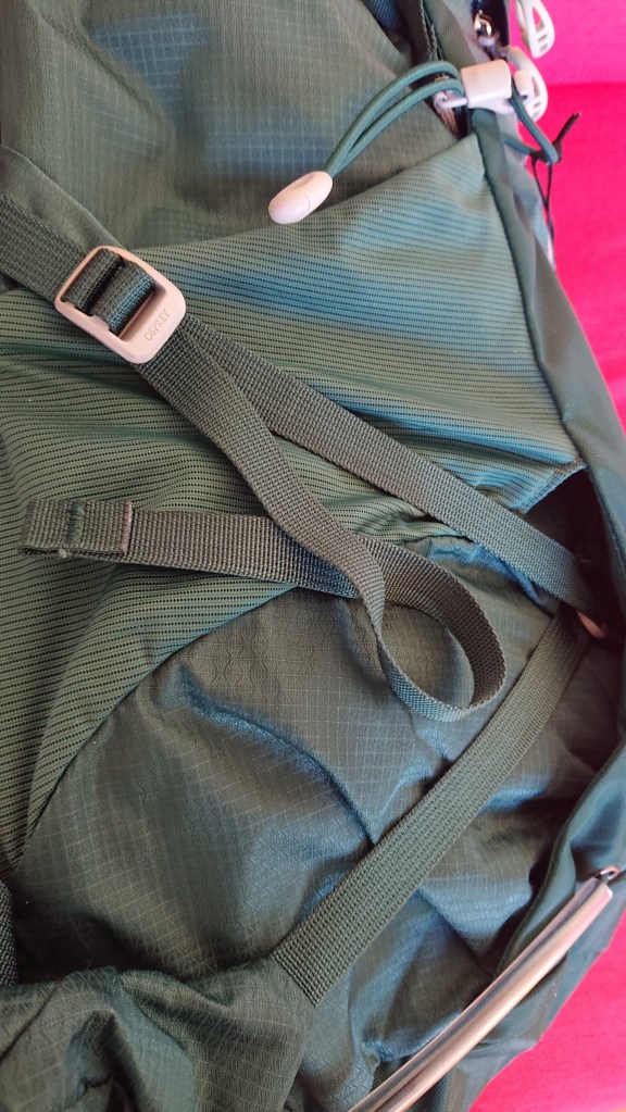Compression: There is still an inside/out option for the compression strap on each side so you can tighten the mesh pocket down or leave it open for things like in my case the water bottle. BUT the strap starts from the edge of the hipbelt pocket, so it MUST go over the bottom of the pocket before threading it through a plastic ring under the vertical panel for the second crossing and from there, the choice is yours – over or under the pocket. This is not ideal for reaching and replacing water bottles without stopping, which I like to do, but as you can see above, this is a moot point as I can’t possibly reach the bottle in that deep pocket without taking the pack off. A shame – I really liked the true inside-out compression. And the upper compression strap is a brilliant addition, though I would have preferred it to have a clip I could open to quickly and easily put my umbrella, or tent poles, or whatever, in place. A minor niggle though, compared to actually having it. When the pack isn’t full, it will be handy to be able to compress the content rather than have the pack body wobbling about at the top, since there is no lid to cinch down.