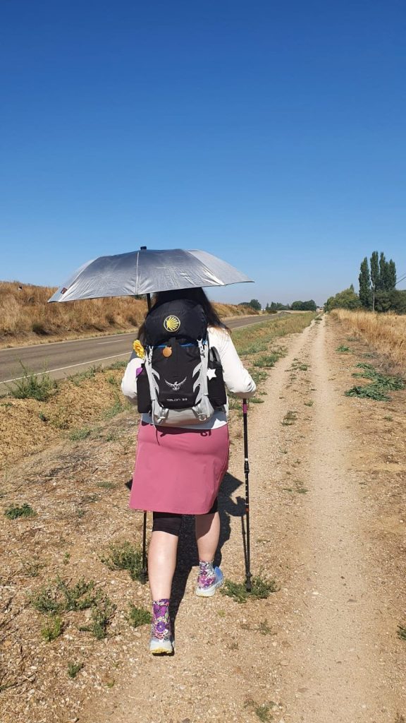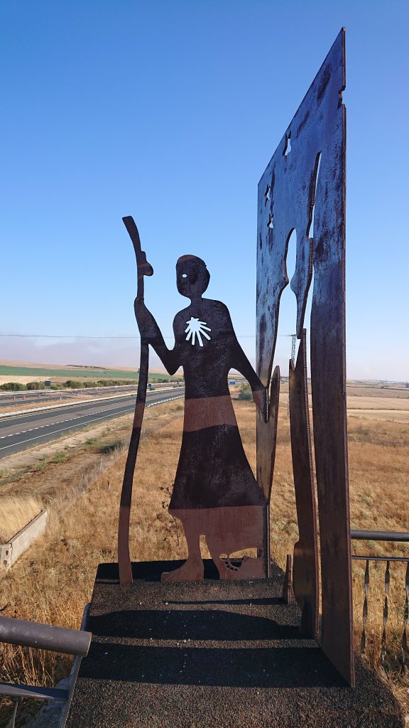 In Carrión I got the best seat in town in the shade overlooking the Plaza Mayor, where pilgrims came and went. I just stayed there having a drink and a meal with familiar and new faces – David joined me, then Laura with the beaming smile from the loft in Castrojeriz came to say hi, and young Nicole who looked like she was looking for something (she was – the shop) or someone, so we flagged her down as well, and a couple who had walked from France came and had a meal. Even Andiana Jones got in touch, he had decided to carry on across the long stretch of nothing with his friend and ended up walking 37 kms, so we probably wouldn’t see him again. All the more reason to enjoy each other’s company in the here and now, but although it was a Saturday and tempting to stay up, the 17 kms with no services were waiting in the morning … which I should have shopped for, but forgot. David had got me an Aquarius and a banana, and I got a plastic packed croissant and a Coke from behind the bar before bed, that would do for breakfast.