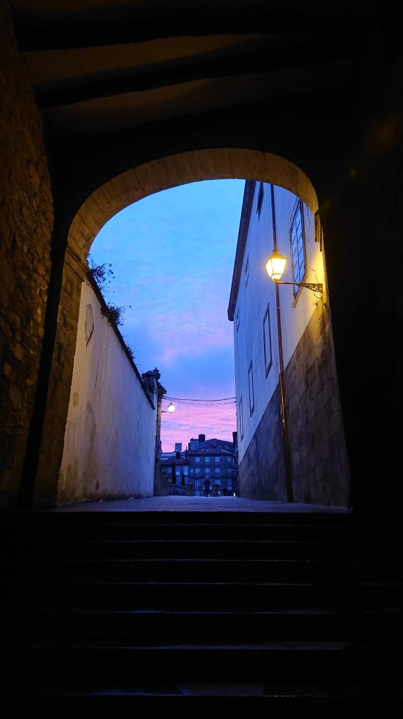 What do you do when you wake up in Santiago and have nothing to do, nowhere to go, and can’t seem to get back to sleep after waking up at pilgrim o’clock? Well, if you’re staying in the Pinario, you can go down to the Obradoiro square just to see dawn changing the colour of the old stone buildings from blue to pink to yellow.