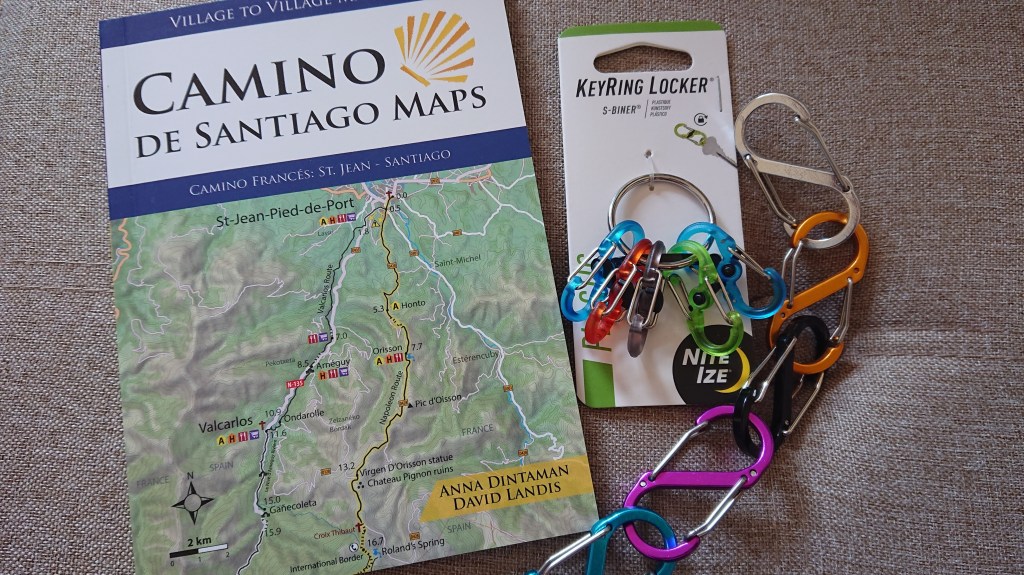 So yesterday, when I was supposed to translate my daily amount of pages so I can have a week+ to do long walks to train and test my kit, I emptied the kit box. I took out all the boxes inside the box and emptied them too. I used the spare covid test bio waste ziplocks to separate knots of safety pins, lots of S-biners, and spare kroner and euros. I used spare airport security liquids ziplocks to organise small piles of toiletries stuff, kitchen and food stuff, shoe and poles stuff. I emptied my first aid kit and restocked it. I found my shell! I used different coloured zipped drybags to separate foot care from sundries and spares. I repacked my toiletries bag, now that I am staying in rooms and won’t need my albergue shower bag set-up, and swapped the old, scratchy child-size hairbrush for a new one I found. I put the topless plastic bottles in the recycling and the old mementoes in a box inside the box. I found stuff I can sell to raise money for my travels. In short: I thoroughly enjoyed myself. And then the post came with more stuff! Mini biners! Who knew?