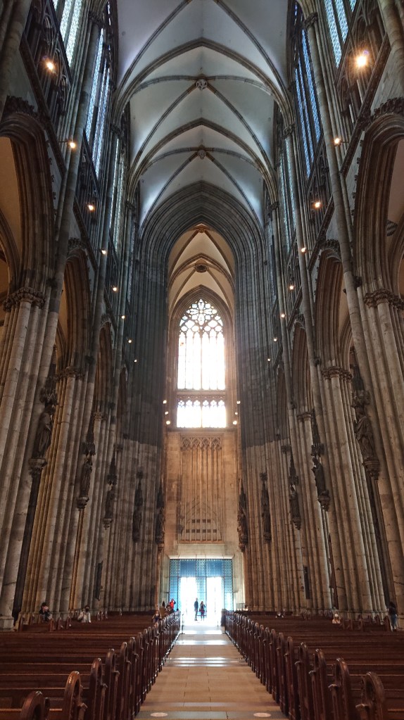 We met in the afternoon, sharing a tiny room close to the impressively beautiful and impossibly tall Kölnerdom, the Cologne cathedral, and went out to sightsee a little while it was light and also find our route out of the city centre for tomorrow. We visited the cathedral, got a stamp as we went in, and heard a quartet warming up for their concert in the beautiful space later that evening. Unfortunately it would be late for us so we decided to give it a miss and have some Flammkuchen – like a very thin pizza with crème fraîche instead of tomato sauce, and traditionally topped with chopped onion, bacon pieces and cheese – for dinner instead.