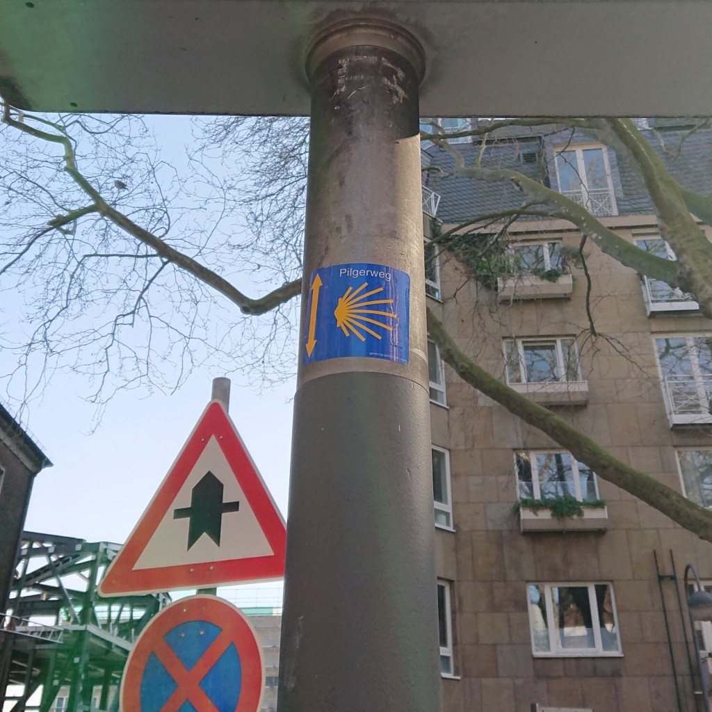 The next morning we discovered to our great joy that the breakfast was fantastic, so we feasted on breads, cereals, yogurt, cheeses and hams, even hard boiled eggs, and lots of good coffee. (And yes, we did make a packed lunch to take with us). Then off we went, walking past the Kölnerdom again, and followed the city streets for kilometers and kilometers. And suddenly, as we were standing on a corner waiting for the green light to cross, someone behind us said hello – or as I remember it now, he said Buen camino. We turned, and there was a young couple with daypacks, and the man wore a Buff around his neck with a camino stamp pattern on it! You can guess the rest.