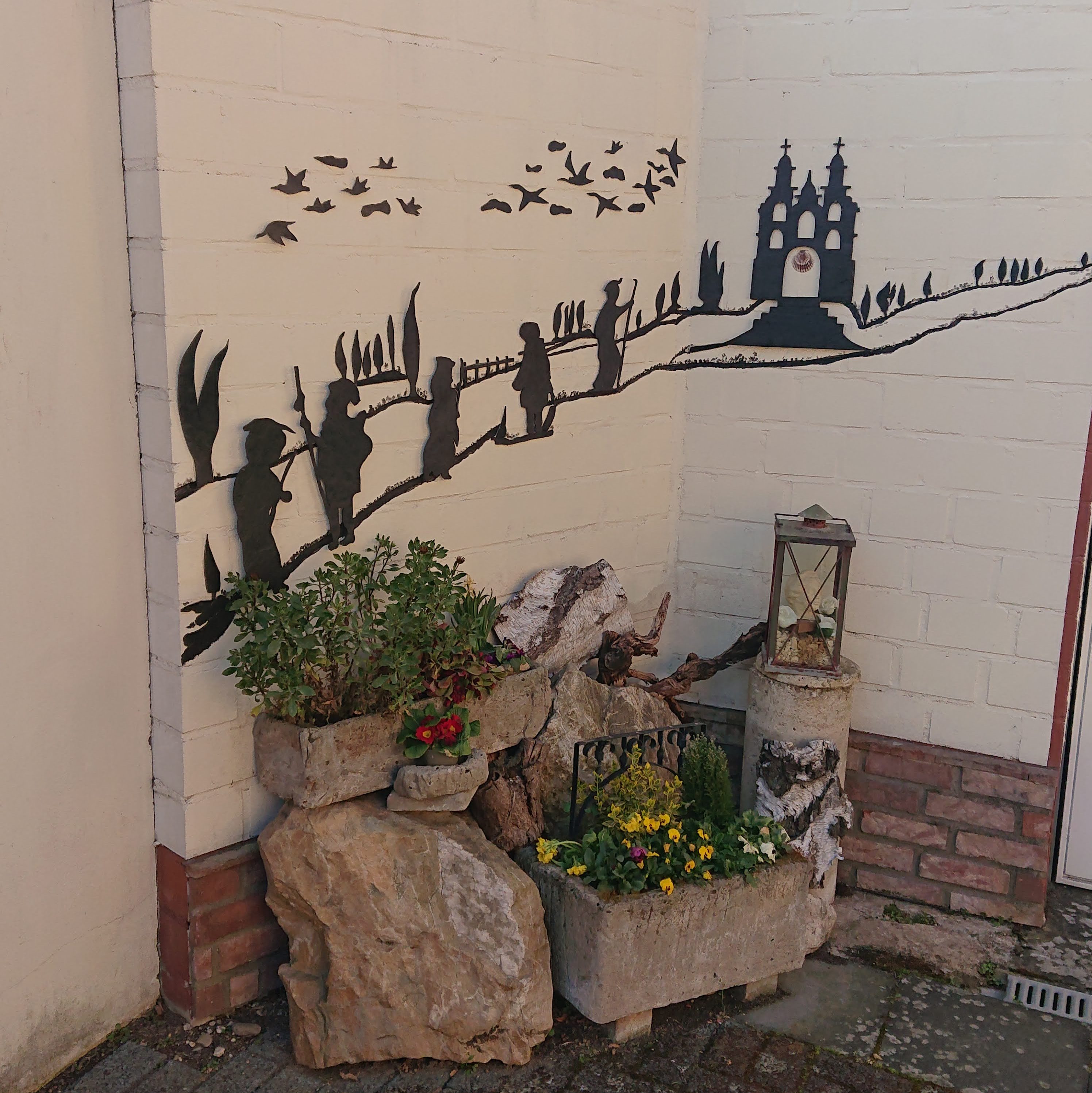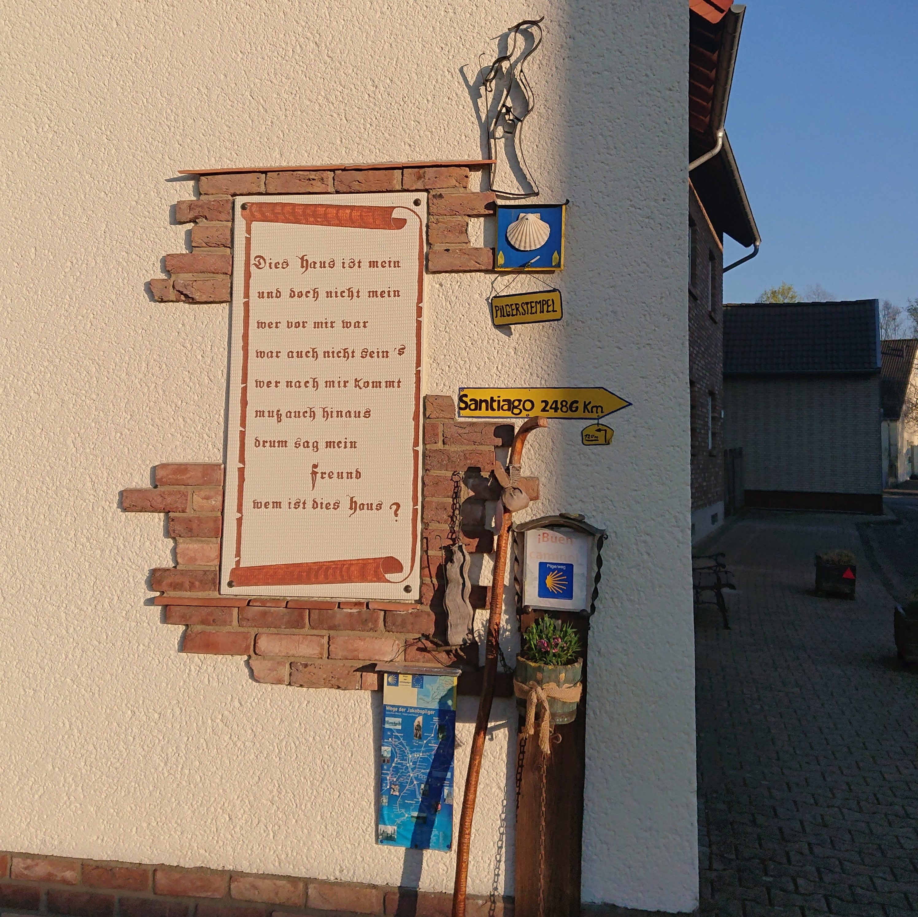 On the way to Walberberg, which made me giggle every time someone said it out loud, we walked past a house with an unmistakeably pilgrim decoration on the corner. It said they provided stamps, so we stopped and looked around, and found a clear plastic document wallet folded over and stuck to a metal garden door with magnets – inside were stamps on stickers, so we could help ourselves and peel and stick them into our credencial. But as we were hanging the wallet back on the door with a clang, the lady of the house came out and told us she had a real stamp, so we put the stickers back again (great idea though!) and chatted with her for a bit.