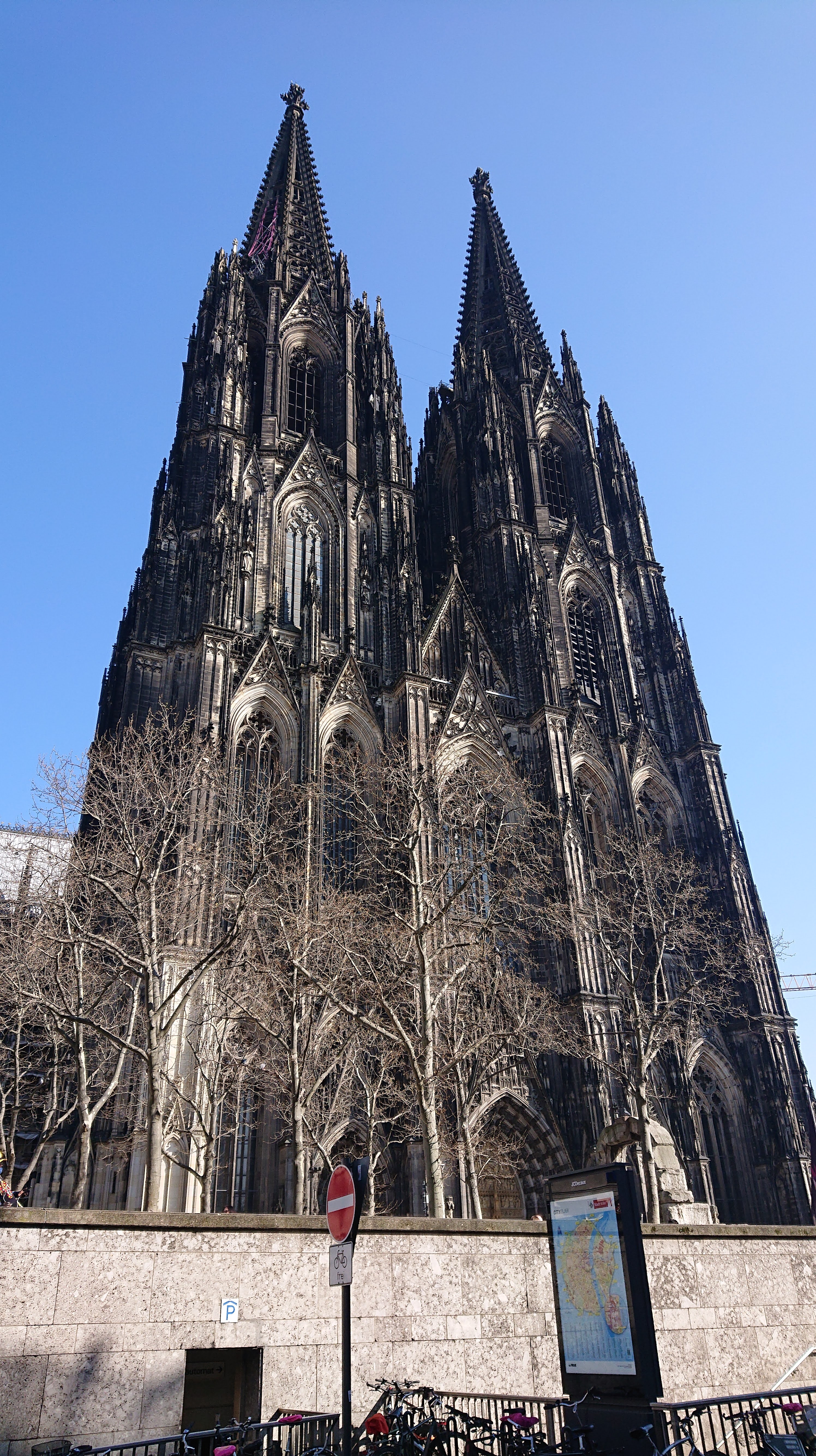 We met in the afternoon, sharing a tiny room close to the impressively beautiful and impossibly tall Kölnerdom, the Cologne cathedral, and went out to sightsee a little while it was light and also find our route out of the city centre for tomorrow. We visited the cathedral, got a stamp as we went in, and heard a quartet warming up for their concert in the beautiful space later that evening. Unfortunately it would be late for us so we decided to give it a miss and have some Flammkuchen – like a very thin pizza with crème fraîche instead of tomato sauce, and traditionally topped with chopped onion, bacon pieces and cheese – for dinner instead.