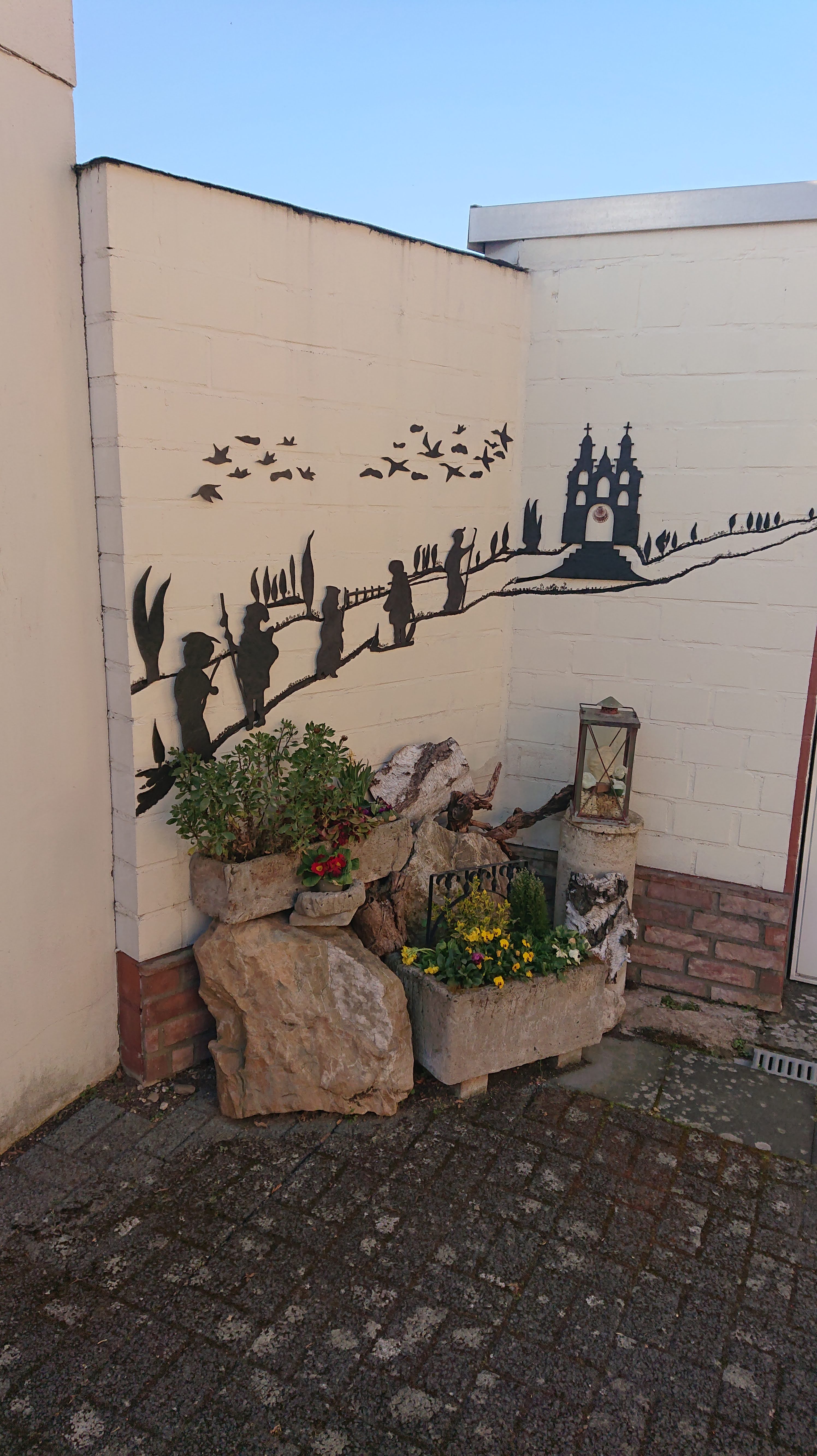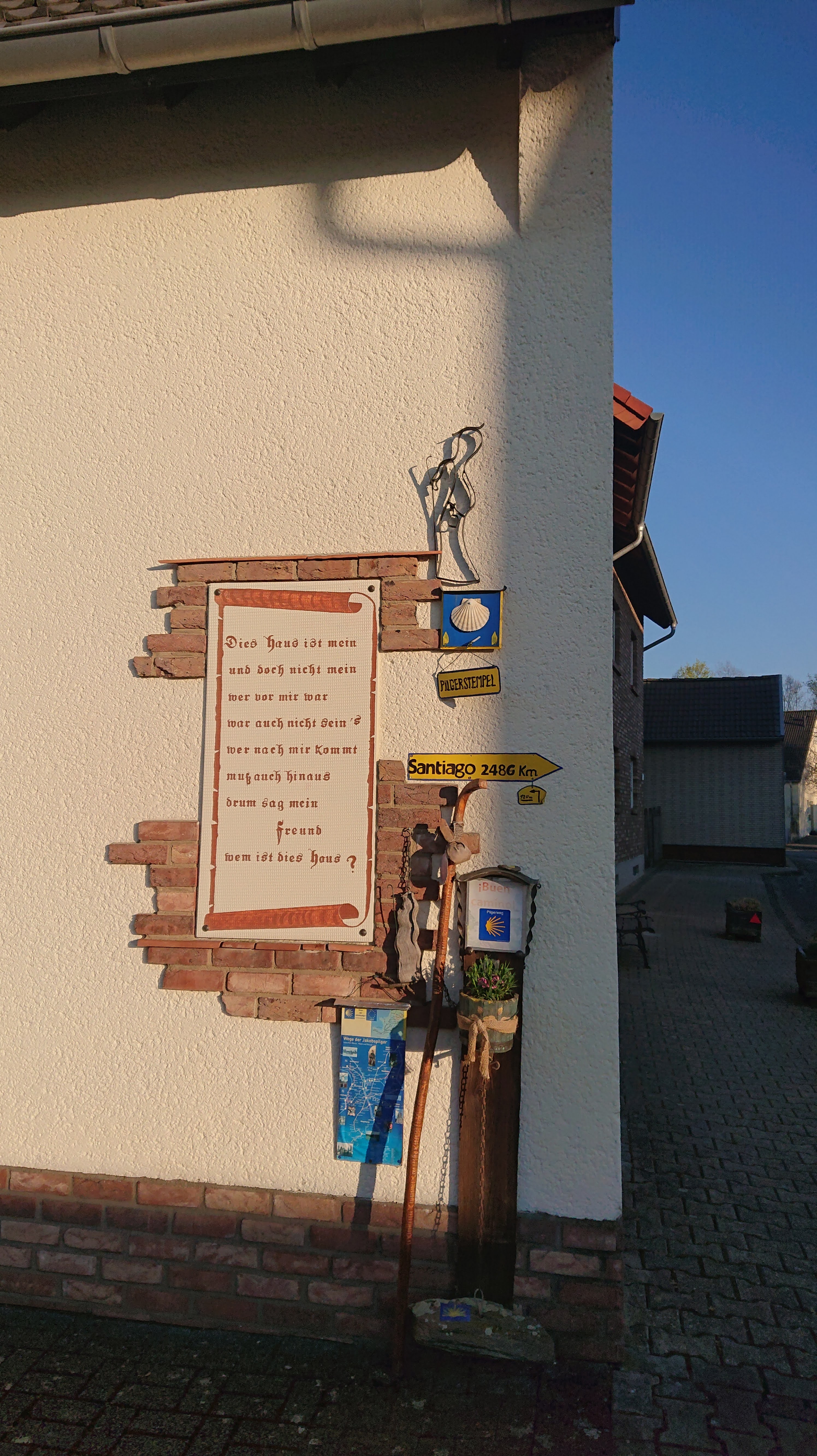 On the way to Walberberg, which made me giggle every time someone said it out loud, we walked past a house with an unmistakeably pilgrim decoration on the corner. It said they provided stamps, so we stopped and looked around, and found a clear plastic document wallet folded over and stuck to a metal garden door with magnets – inside were stamps on stickers, so we could help ourselves and peel and stick them into our credencial. But as we were hanging the wallet back on the door with a clang, the lady of the house came out and told us she had a real stamp, so we put the stickers back again (great idea though!) and chatted with her for a bit.