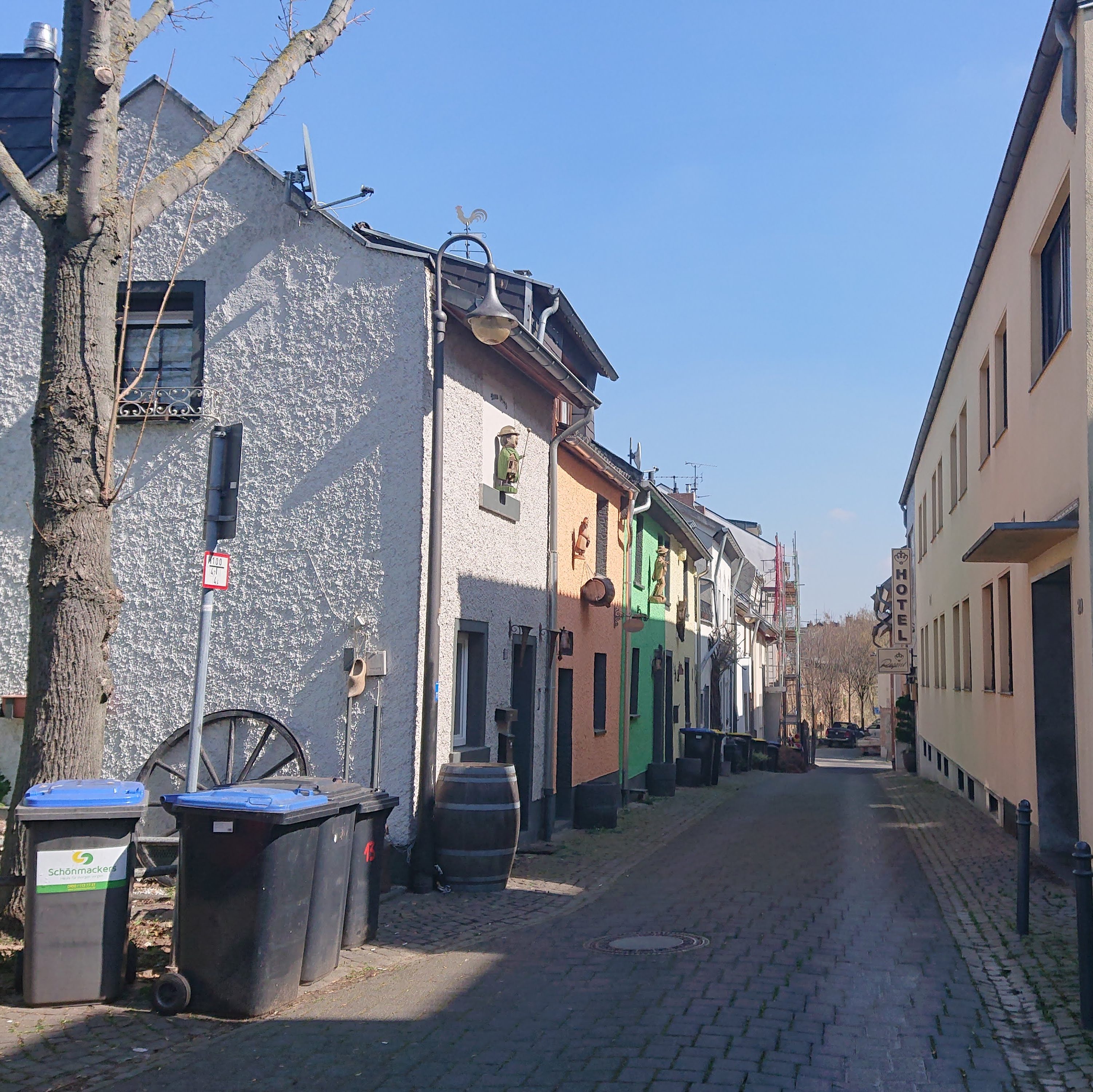 So by the time she messaged me that she was approaching the next village, and the man behind the bar called a taxi for me, I had already checked out earlier flights. There was one in three days. it would cost a little to change it, but so would getting taxis and buses and staying in pensions and hotels and sitting on squares drinking coffees and radlers and eating salads etc. B waited for me in a beergarden in the sun, and both being practical women we basically assessed the situation, agreed I shouldn’t walk any further, but that I didn’t need her to stop walking to take me anywhere. The lovely waitress told us there was a bus to Euskirchen in 7 minutes from across the street, so I went to catch it. B sent me a google map with directions to the hotel and called them to say I was coming early. I can’t tell you how pleased I was to have my Pacerpoles as crutches on my way up the main street! At the top was the Altermarkt, a very cosy little square I thought I might come back and sit in after I had checked in and got ready. And in a pretty side street was our hotel.