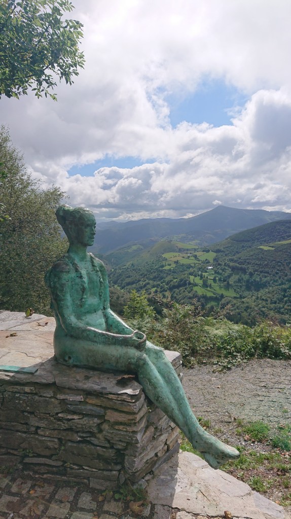 After this short kerfuffle Nicole and I sauntered up to the Galician marker, took the photos, took photos of other people, and then almost reluctantly finished the last km or so up to O Cebreiro. It had been such a lovely walk, in such great company, that I didn’t want it to end. But end it did, on the hilltop, with the magnificent views over the valley below and the statue of the peregrina pondering her walk. As we stood there we started chatting to two lovely Canadian ladies who had just arrived to walk from O Cebreiro in the morning. One of them had done it before, and the other was on her first camino. I think we both felt a stab of first time camino envy.