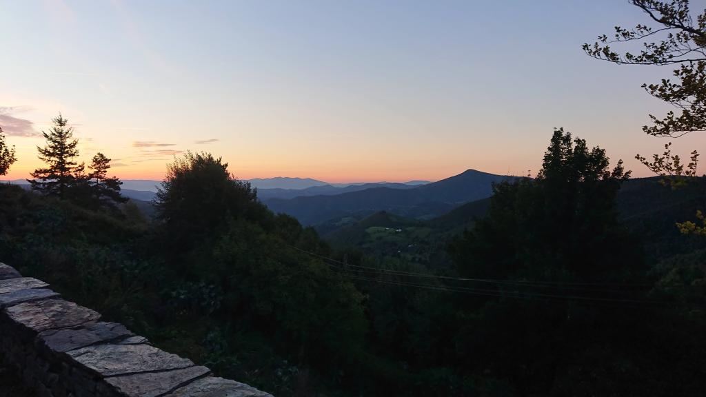 The bar has a restaurant, rooms and beds too – I stayed there during some awful weather in 2012 and got a crash course in camino kindness when the host got out in his tractor in the heavy rain and drove down the narrow track to pick up struggling and soaking wet pilgrims, took them back to the albergue and laid out spare mattresses for them in the dining room. That’s one of the reasons I always stop there and spend some money, even though I have spent the night in O Cebreiro since. It must be lovely watching the sun go down and also rise from there though. But if you arrive late in the walking day, beware of the cows quite literally coming home – all of a sudden they will come trundling down the narrow road between the bar and the outside tables, and most of the time they aren’t bothered about stupid, interchangeable walking people sitting still with a drink.