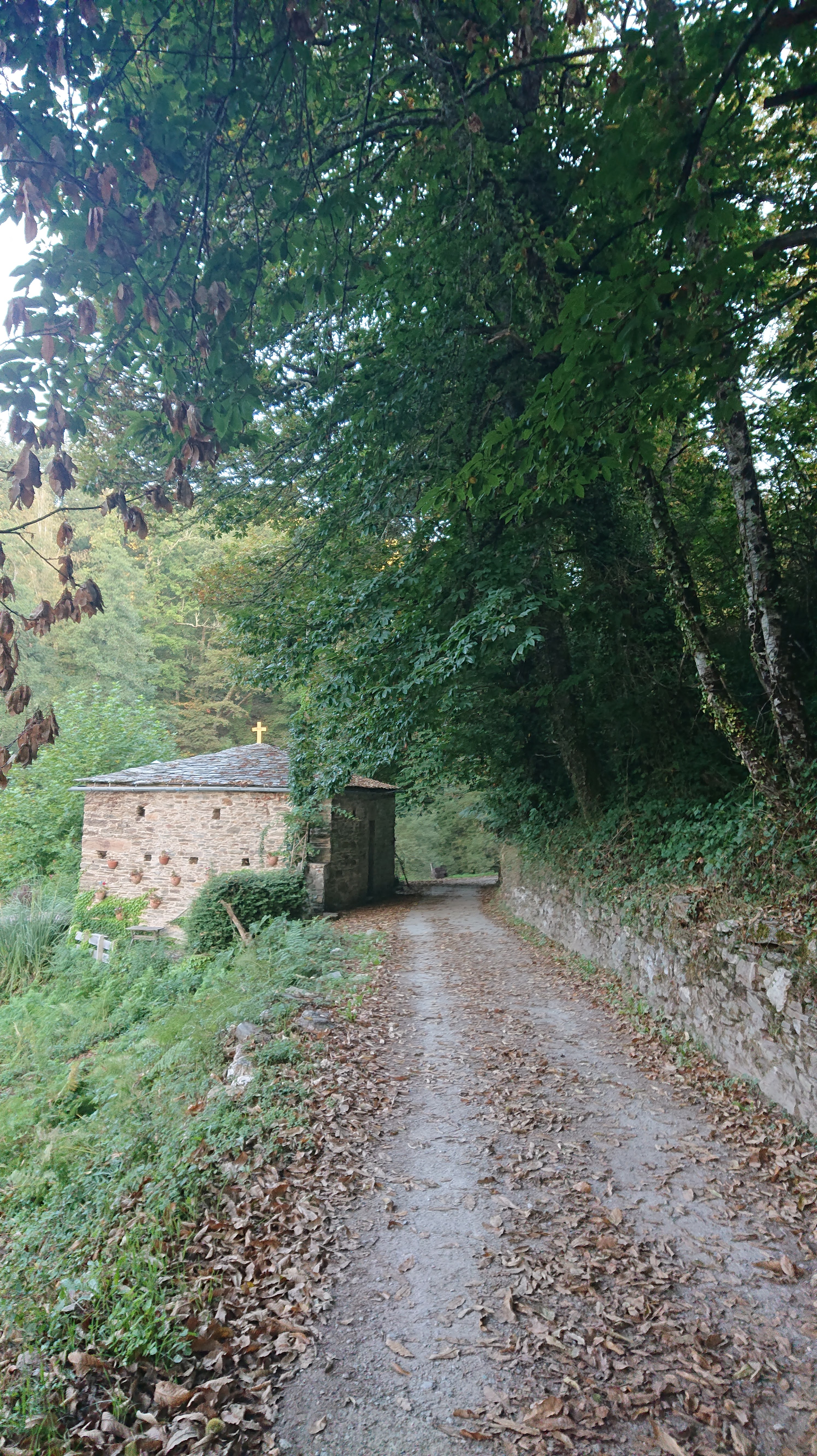 The good news is that the El Beso – The Kiss – albergue was open again with all its rural charm and eco goodness; the bad news was that Art’s Art gallery was closed. Otherwise it was a joyful and glorious day in Galicia! After A Balsa, with its lovely tiny chapel dedicated to San Antonio, finder of lost things, the trail led me up, up, up through the lush green woods like an echo of the walk up to O Cebreiro. At the top is the shell shaped fountain where everyone stops and takes a break and gets someone (me) to take their photograph.