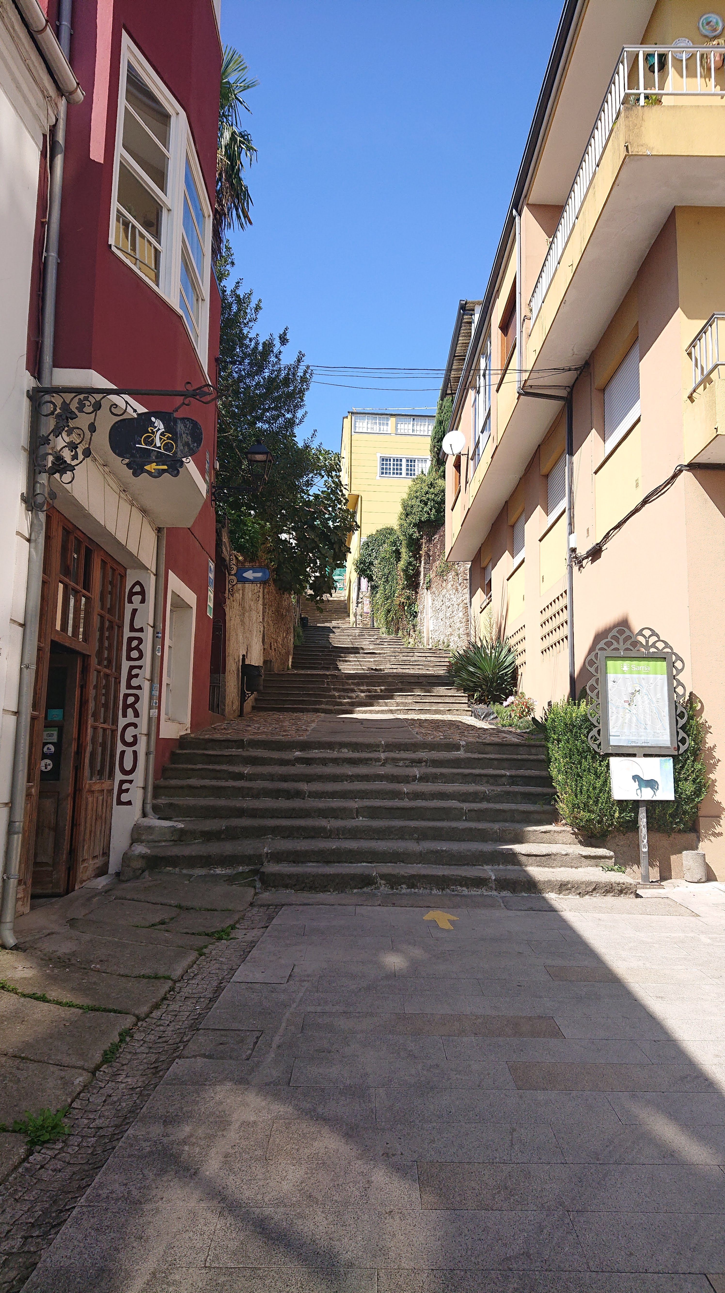 When I arrived in Sarria, hot and dusty, I even took the stairs up to the main pilgrim drag! (Would not recommend.) I checked into the O Durmiñanto albergue, which was new to me but looked good, and was the first into a new room so I could pick my bed! I dithered for a bit before I settled by the window – and then realised I had plonked myself as far away from the only charging point in the room as humanly possible. Bring power banks, people. They can be left unattended to charge.