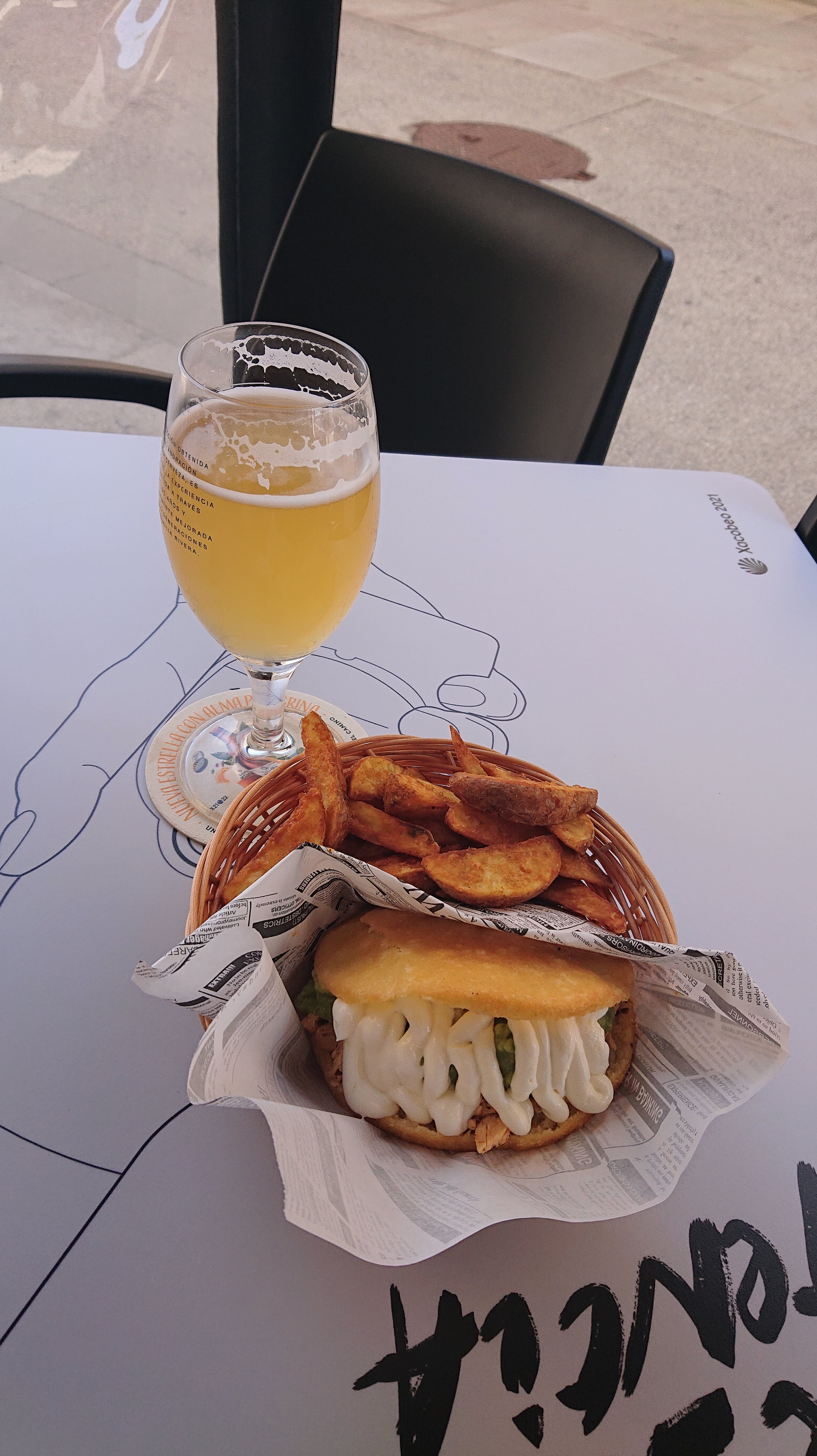 I didn’t have to go far. Just a few doors down was Razas Gastrobar, which had recently opened, with a particularly beguiling looking table outside, in the shade, by the main pilgrim drag – and a menu board that mentioned burritos and smashed burgers, so it seemed a bit more interesting than the normal pilgrim menu. I also discovered that they had arepa, which I had never heard of until Nanci introduced me to them in León on a camino rest day. Arepa are South American pancake type things made with maize flour (so gluten free), opened like a pitta bread and stuffed with different goodies. I couldn’t resist trying one with spicy shredded chicken, salad, guacamole, pico de gallo and garlic mayo. It was delicious and a nice break from Spanish and even Italian food (until the evening).
