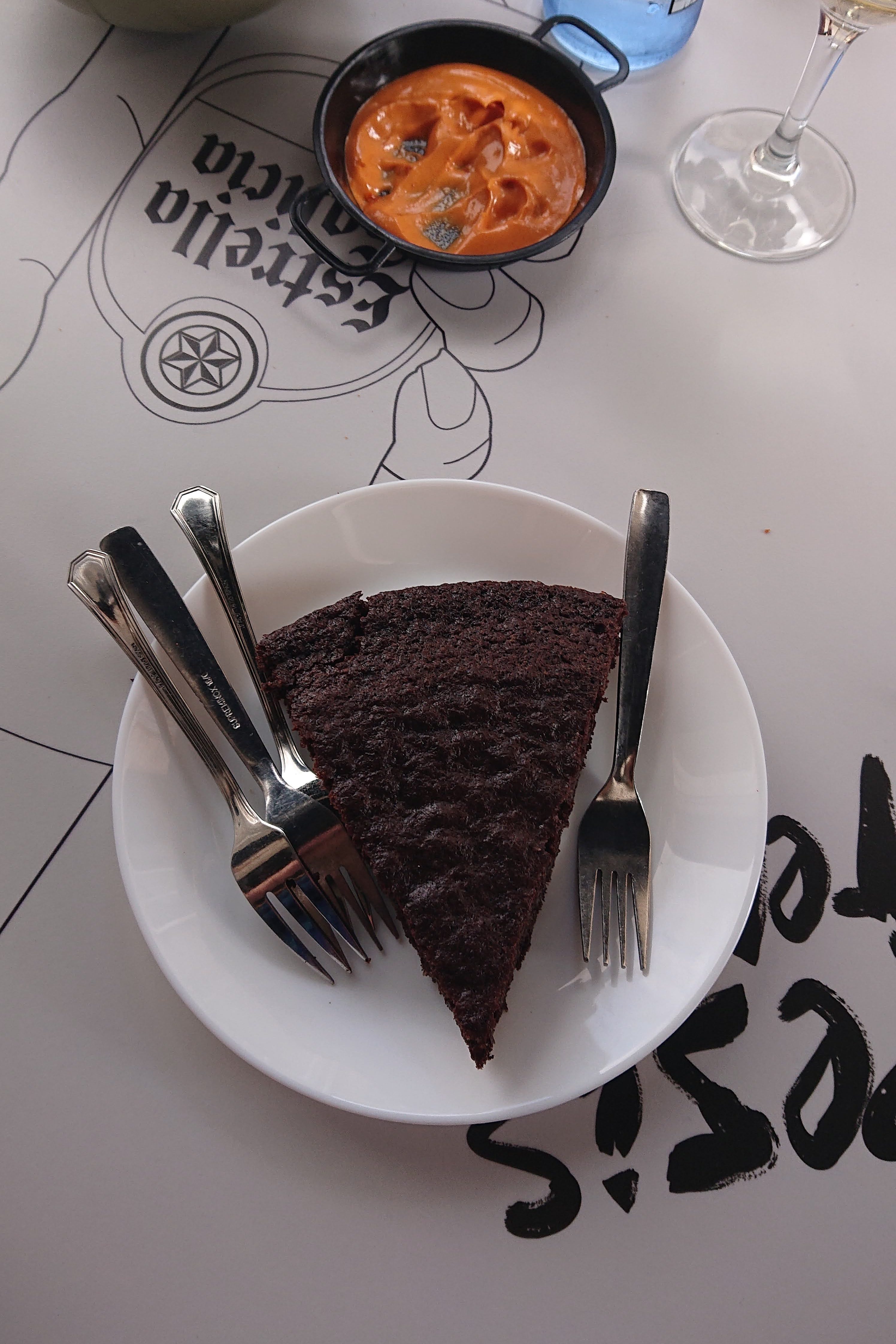 Then, after all this food, it was time to go to dinner … The booking was for five people, six with Swiss Iz, and seven when another sola lady joined us, but there was room for everyone. I can’t remember which pizzas we all had but the photo below (thank you, Stacy!) looks like a carbonara and a vegetarian one with avocado? The menu had all the classics plus a sprinkle of very interesting own creations, like mine, the Arzuiña: topped with mozzarella, tomato sauce, fresh chorizo, grelos – yup, that’s the soup tree greens! – lots of creamy local Arzúa cheese and black pepper. I was certain there was fennel in there somewhere as well. In fact all the pizzas that arrived, looked gorgeous, and I didn’t hear any complaints. We swapped and shared and stuffed ourselves and still there was food left. Very tasty, and I’ll definitely go back again next time.