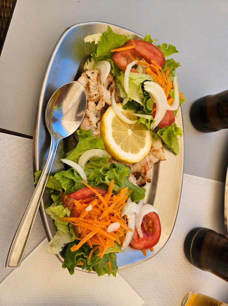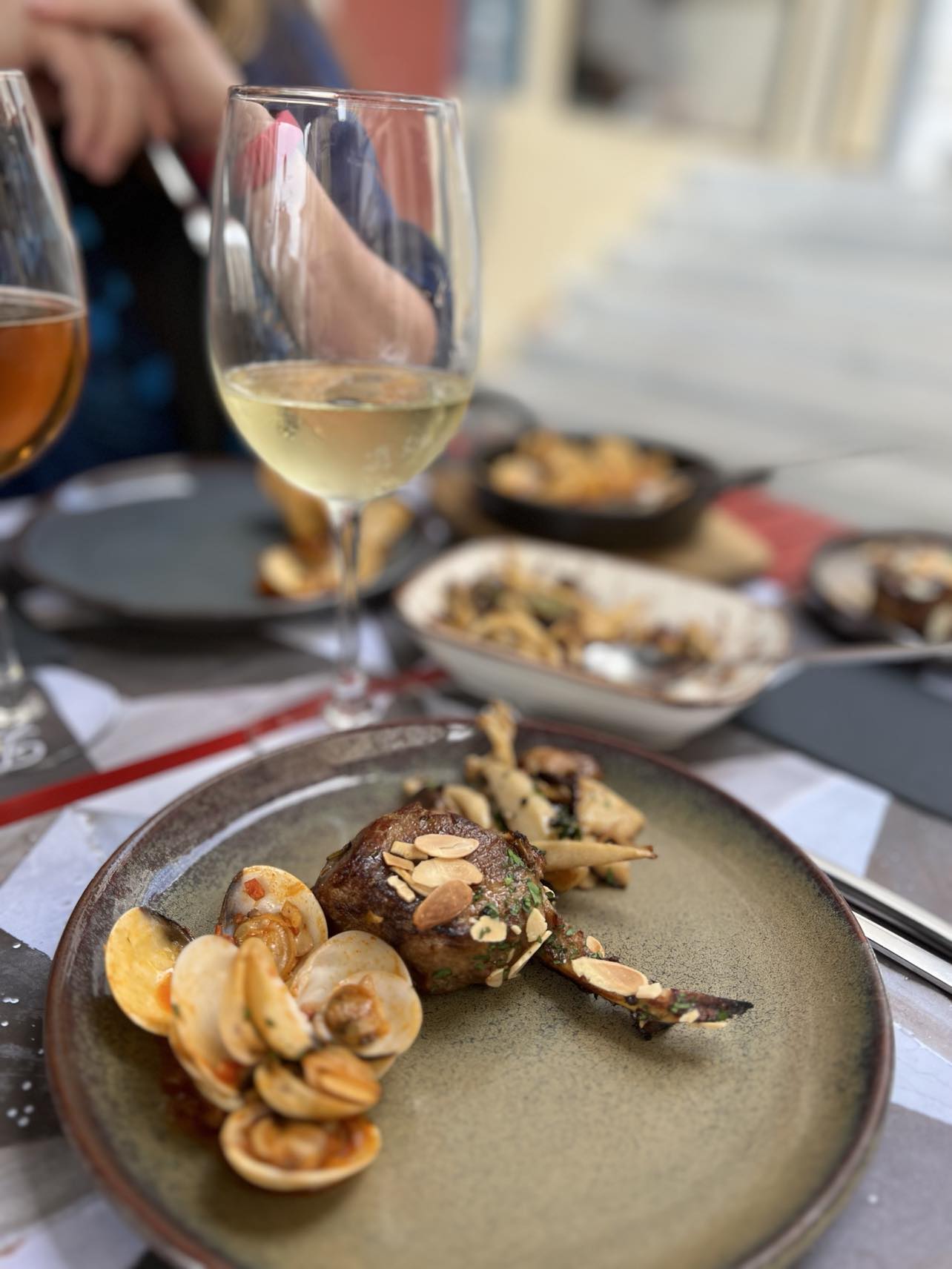 In the early evening we went back out again to try to get a table up on the hill, in Tapas do Norte, which had very good reviews online. We were not disappointed! We sat outside and ordered lamb with honey and almonds, and clams with chourizo … it was sooo good, no wonder the restaurant was full. Nanci still claims it was the best meal of the whole trip and she might be right.