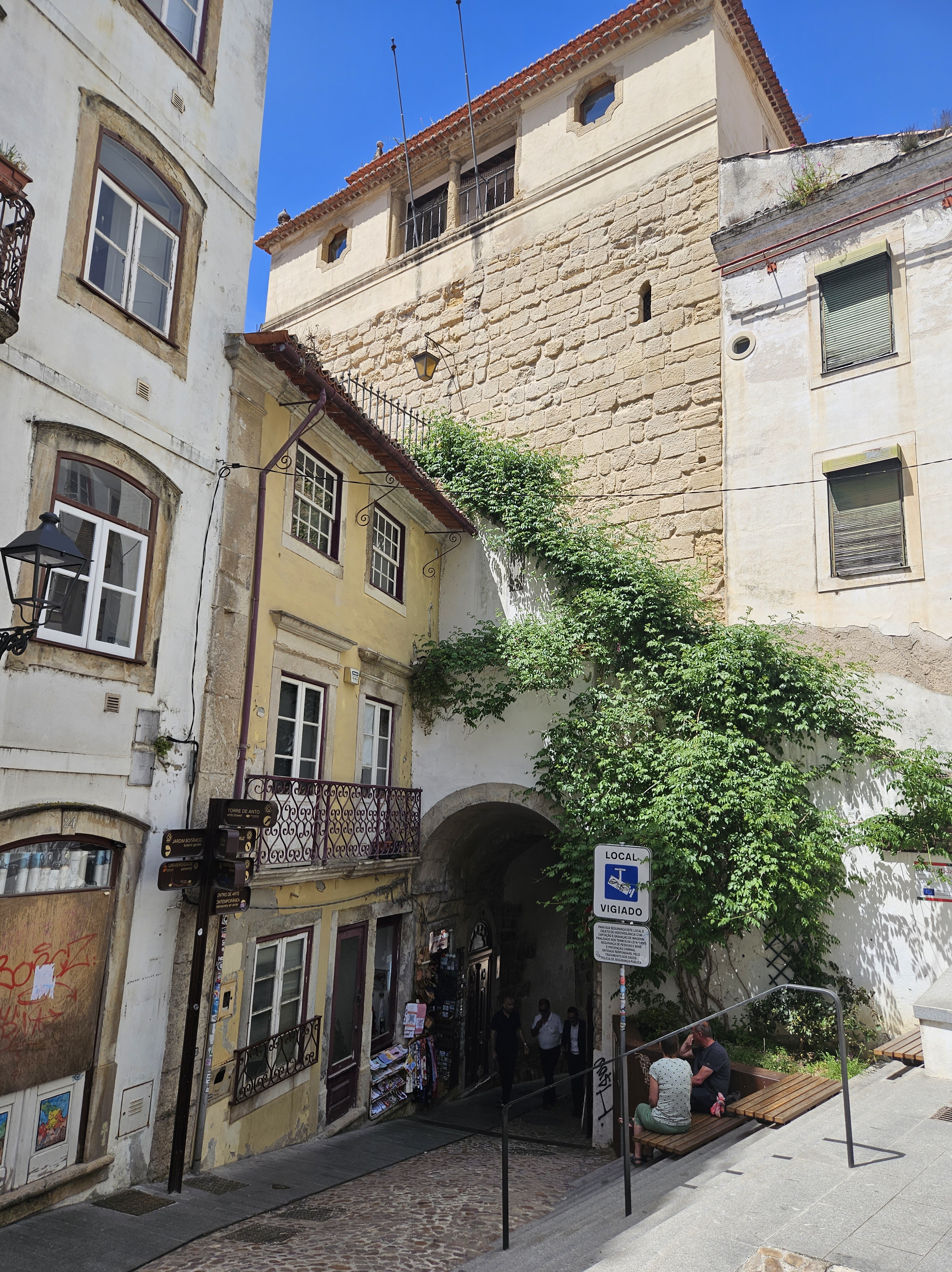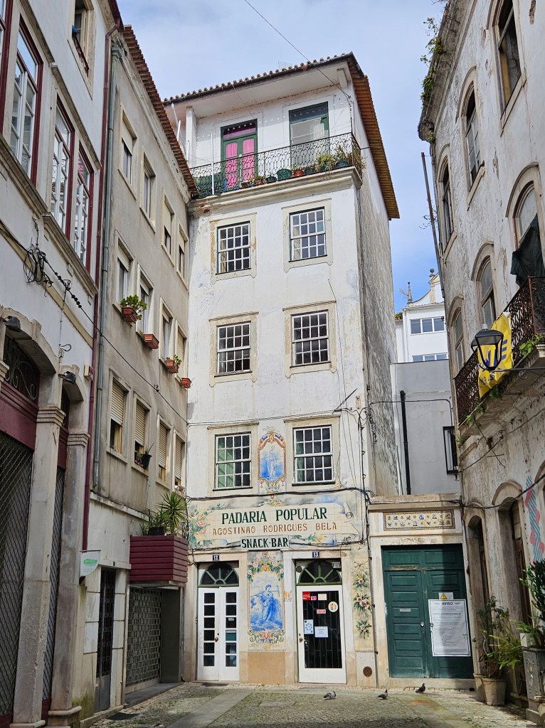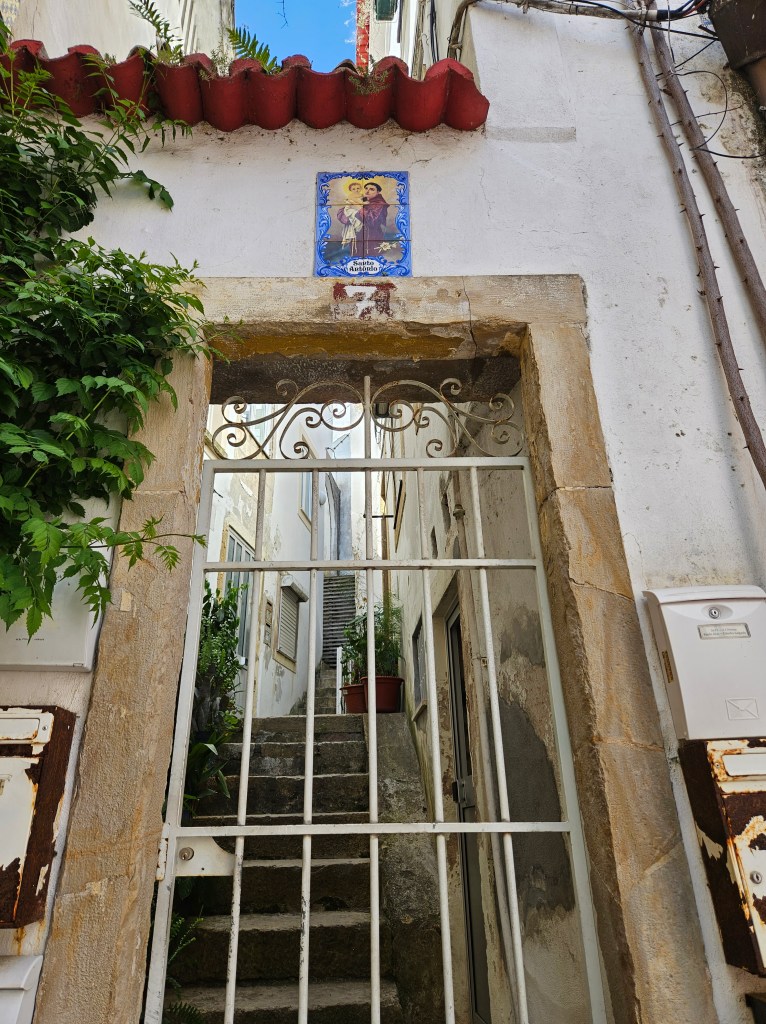 When we arrived, we got another taxi to where we were staying … only we couldn’t. Coimbra is so much smaller than Porto, and with so many streets that cars can’t pass, that we had to walk the last bit. After a lovely lunch of grilled chicken and salad in a bar on a little square near our street (alley), I went to pick up the key to a lovely flat … through a gate, up two stairs, around a corner and up some more steps, in a warren of flats, rooms and outside spaces, tucked away in a narrow lane. It had a definite medieval remnant feel to it, which was great. Much better than a normal hotel (though we missed the air con).