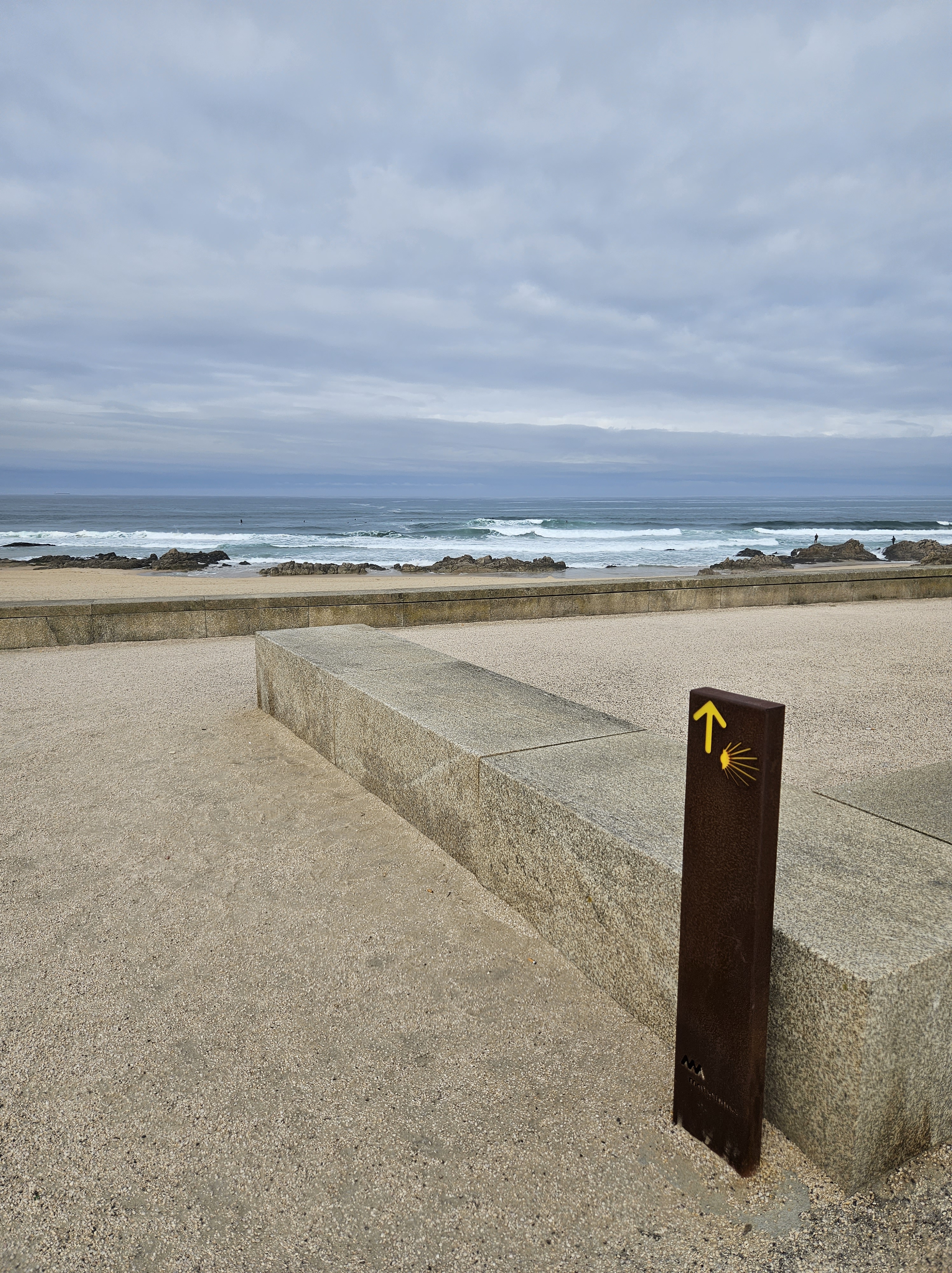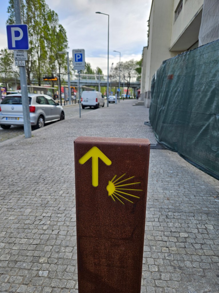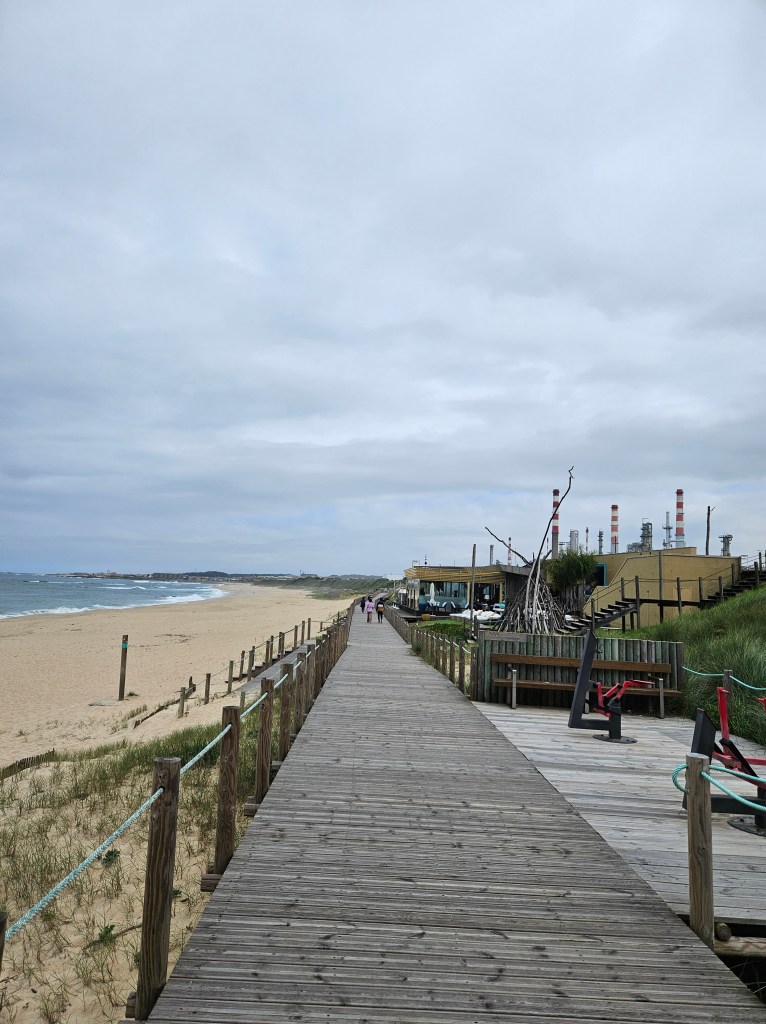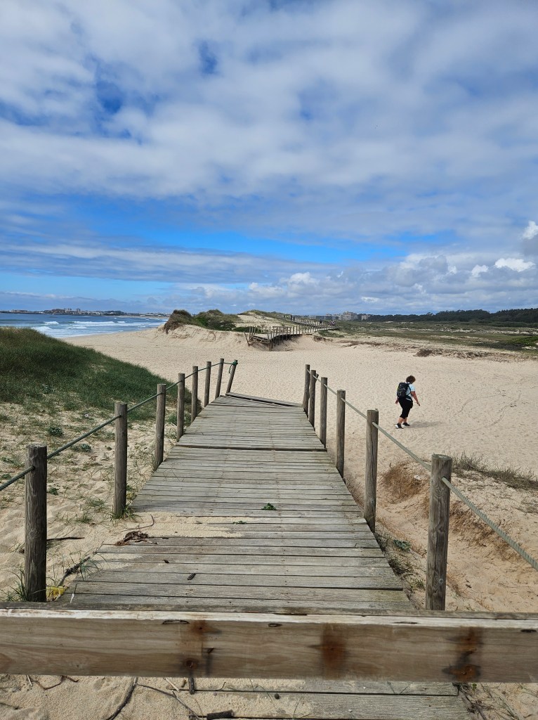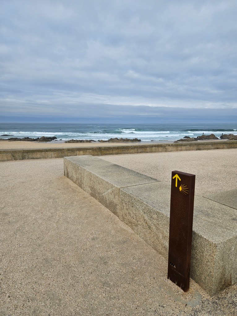 The next morning I spoke to the server in the top floor bar/café, who had walked to Santiago in seven days … he said he would love to do it again, but over two weeks next time. Finding our way into Matosinhos town centre was easy enough, and we saw lots of pilgrims starting from the metro station. Pretty soon we were by the sea again, walking along a wide paved public promenade filled with joggers, dog walkers, childminding grandparents and pilgrims, or on wooden boardwalks.