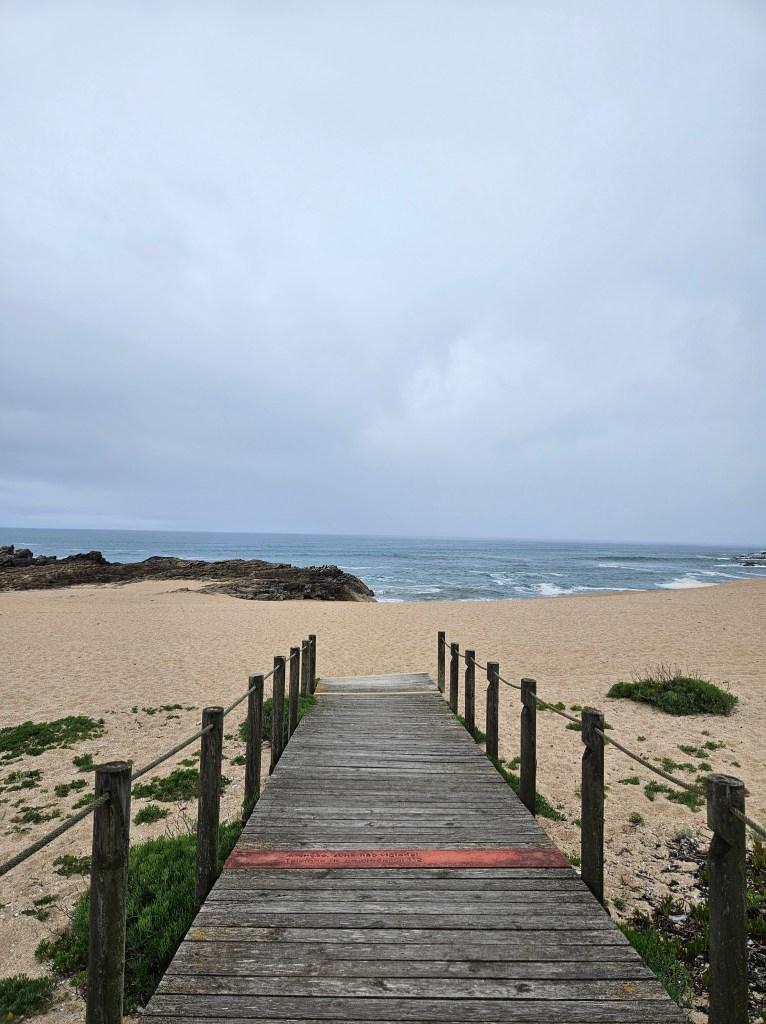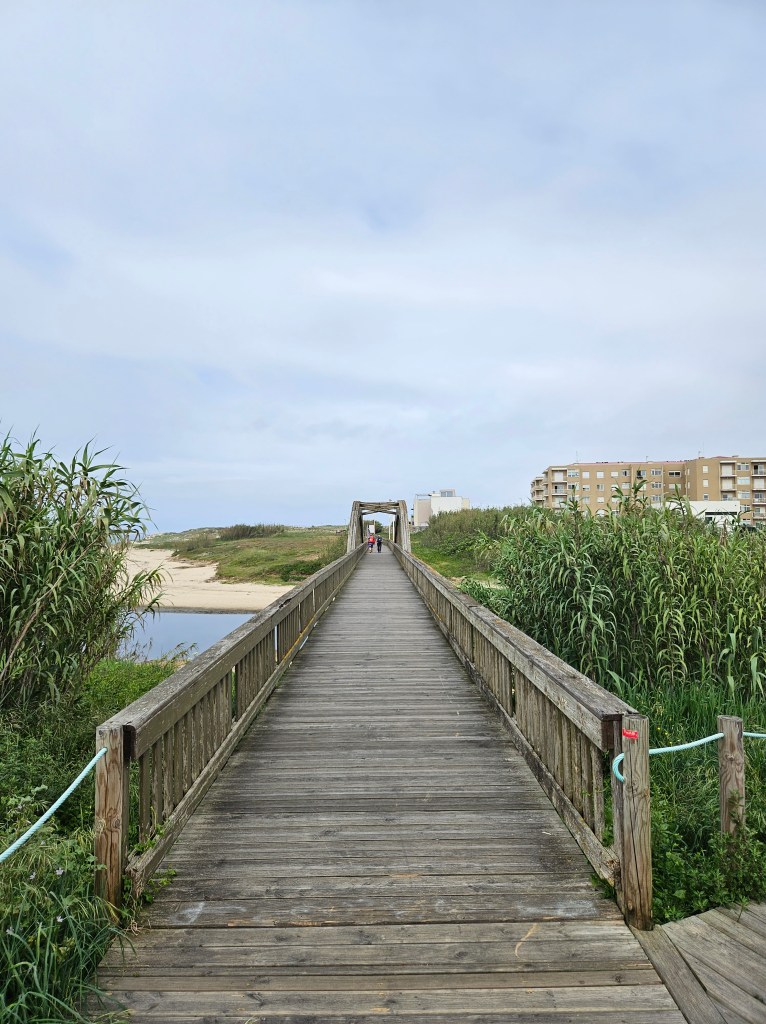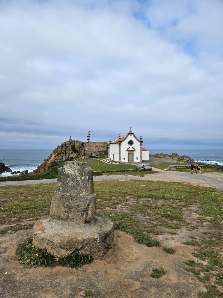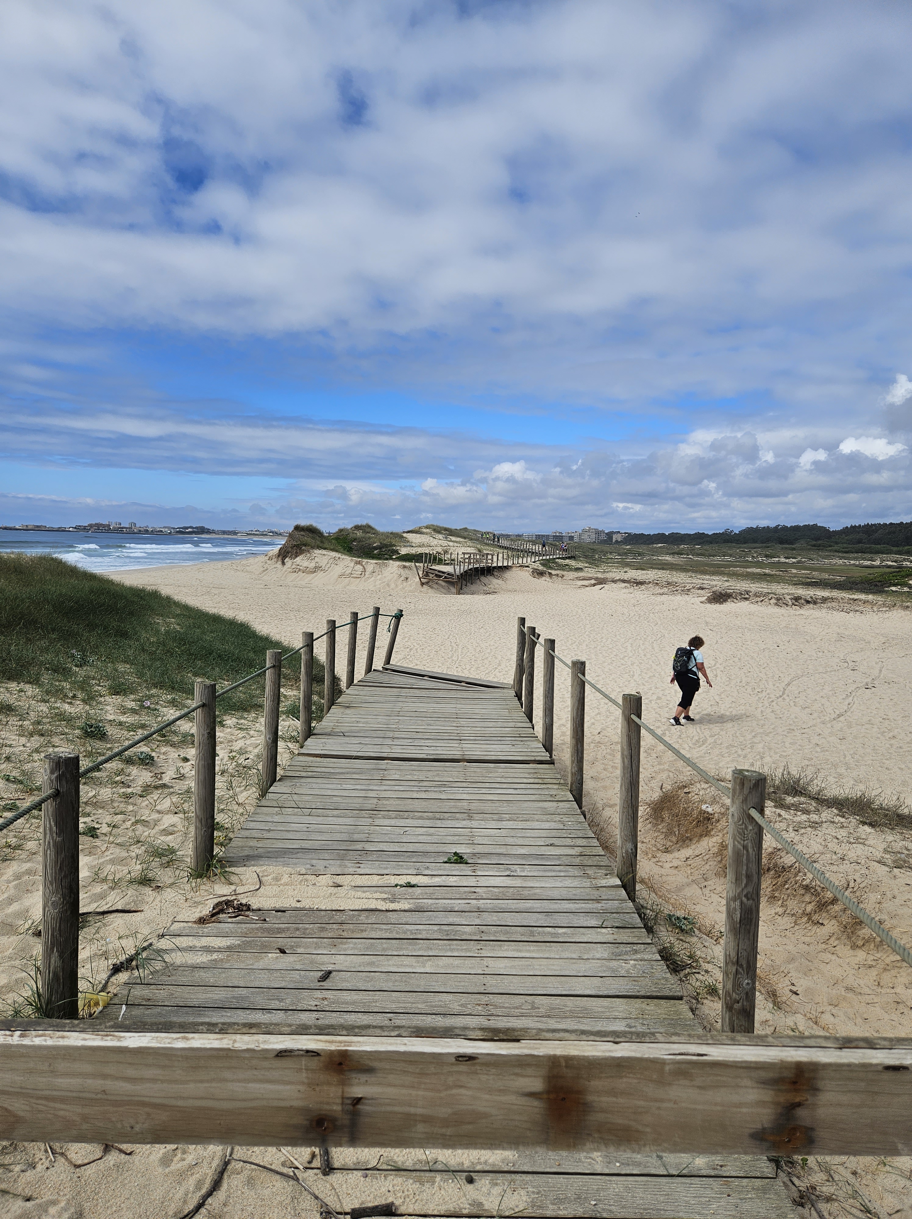 The next morning I spoke to the server in the top floor bar/café, who had walked to Santiago in seven days … he said he would love to do it again, but over two weeks next time. Finding our way into Matosinhos town centre was easy enough, and we saw lots of pilgrims starting from the metro station. Pretty soon we were by the sea again, walking along a wide paved public promenade filled with joggers, dog walkers, childminding grandparents and pilgrims, or on wooden boardwalks.
