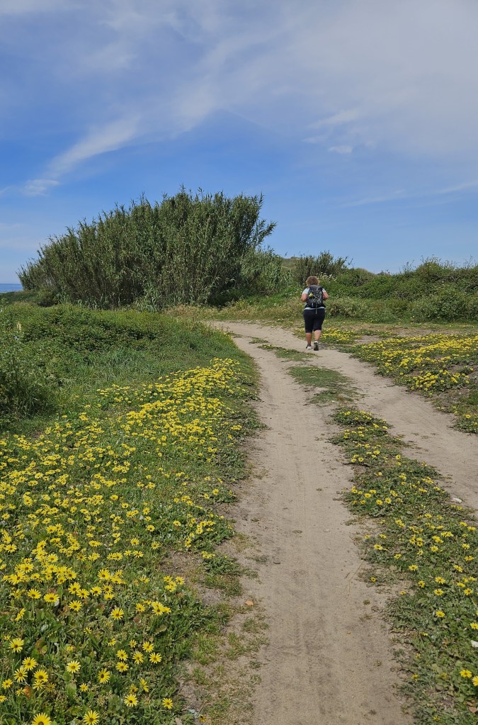 When we got to the big cross by the sea we asked an old weather-beaten gentleman if it was possible to walk to Amorosa along the beach, and he said yes, absolutely, but when we tried it was all pebbles and hard going. Seemed to be lots of different little paths around, but the app was no help, and there was no way we were trying them all. So we turned inland again, towards the main road where there would be places to stop, cool down and rehydrate.