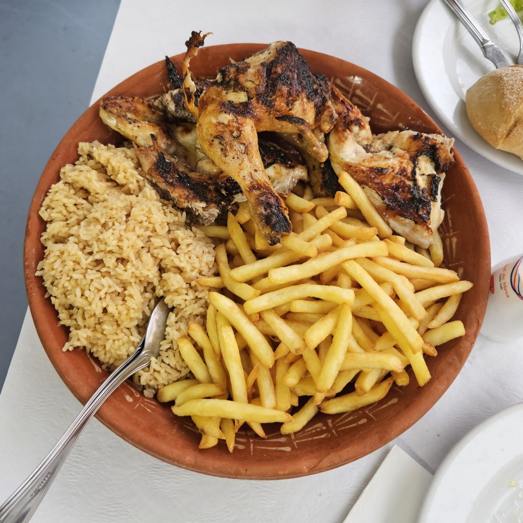 We had booked a flat/house with two bedrooms, mainly because it also had a washing machine – but though there were 5 different kinds of hand soap and 3 kinds of shampoo available, there was no laundry soap what so ever! Most wanderers surely pack shampoo, but not laundry liquid. We still put a machine on with some shampoo, but it wasn’t great. After hanging the clothes out, which immediately made it rain, and quickly bringing them back in again, we also discovered that there was no indoor drying rack. Luckily we both had our elastic lines, so we stretched them across the warmest room. After this domestic success, we went to the nearest hot food place for our meal. And they had piri piri chicken! A wonderful treat after a beautiful day, our last in Portugal.
