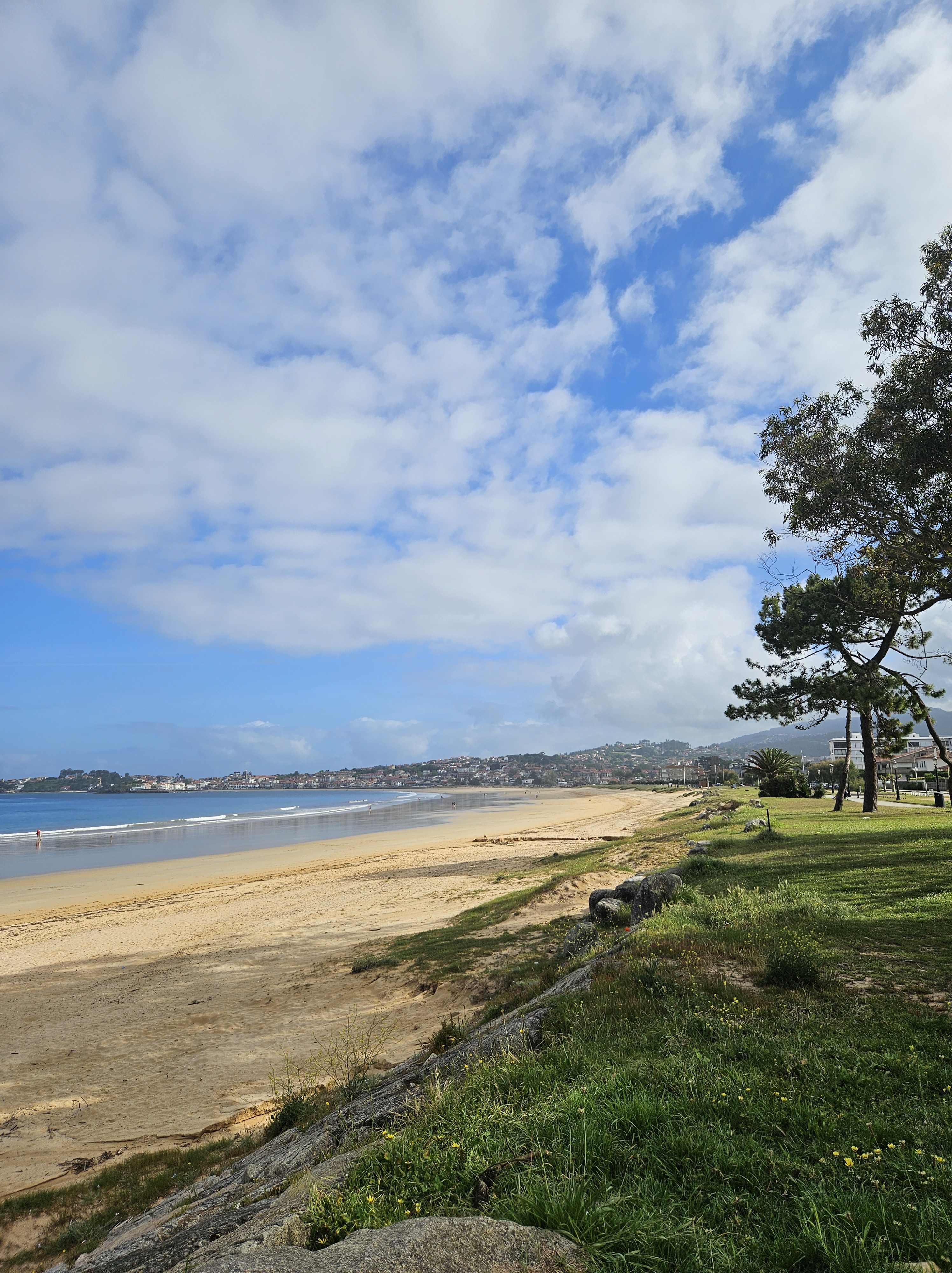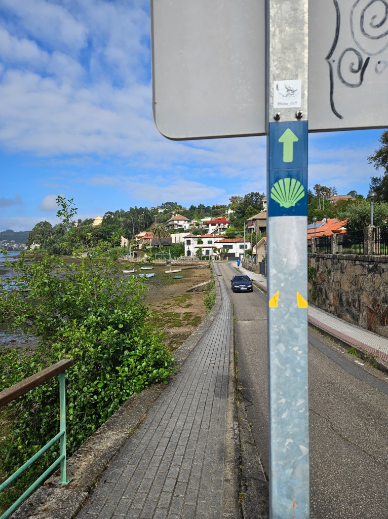 Nanci’s birthday! We had two treats planned: a sushi meal and shopping at Decathlon in Vigo. But first – a trio of beaches for a birthday walk. From the other side of the river we followed green shells and arrows instead of the normal yellow – this is an alternative, beach heavy route.