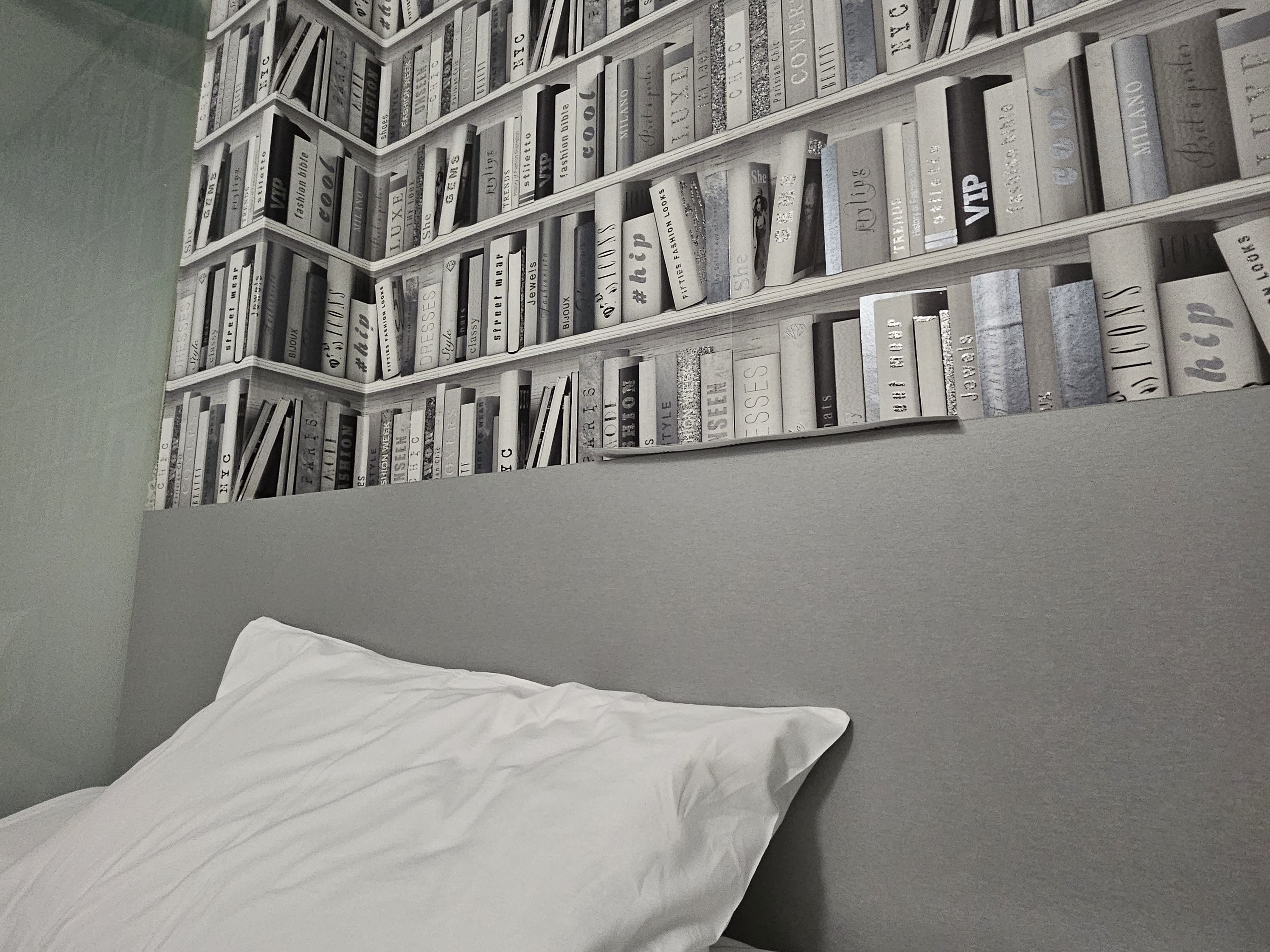 We stuffed ourselves silly and rolled back to the hotel in the early evening to enjoy the big beds in our tiny but cleverly designed single rooms. Look at the lovely wallpaper in mine!