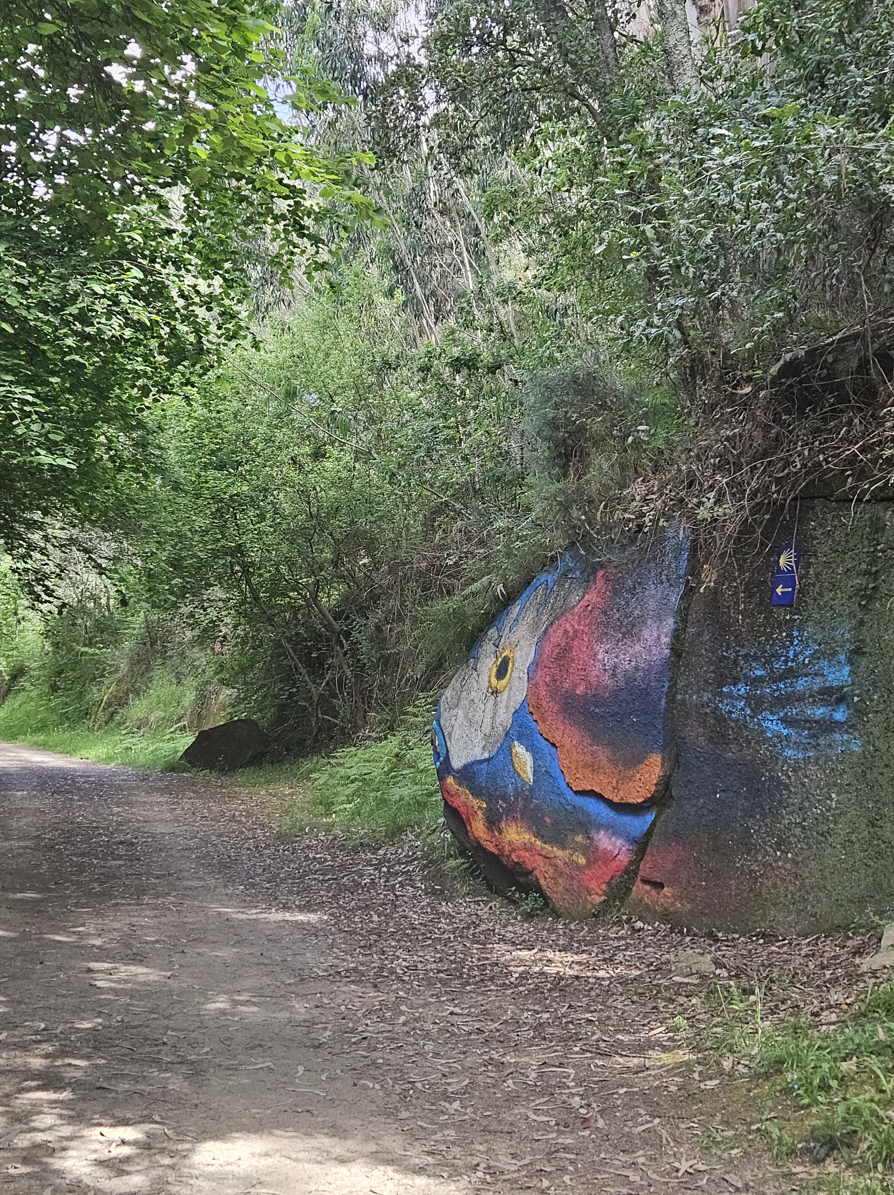 When we walked from Fao, we were told to follow the red path, when we walked to Caminha there was a yellow one, but leaving Vigo, you end up on the green squiggly path! Then further up, into the shady and cool woods, keeping our eyes on the bridge down below. After we were past it, there would be a little bar somewhere, but not easy to spot. Unlike the random goldfish painted rock.