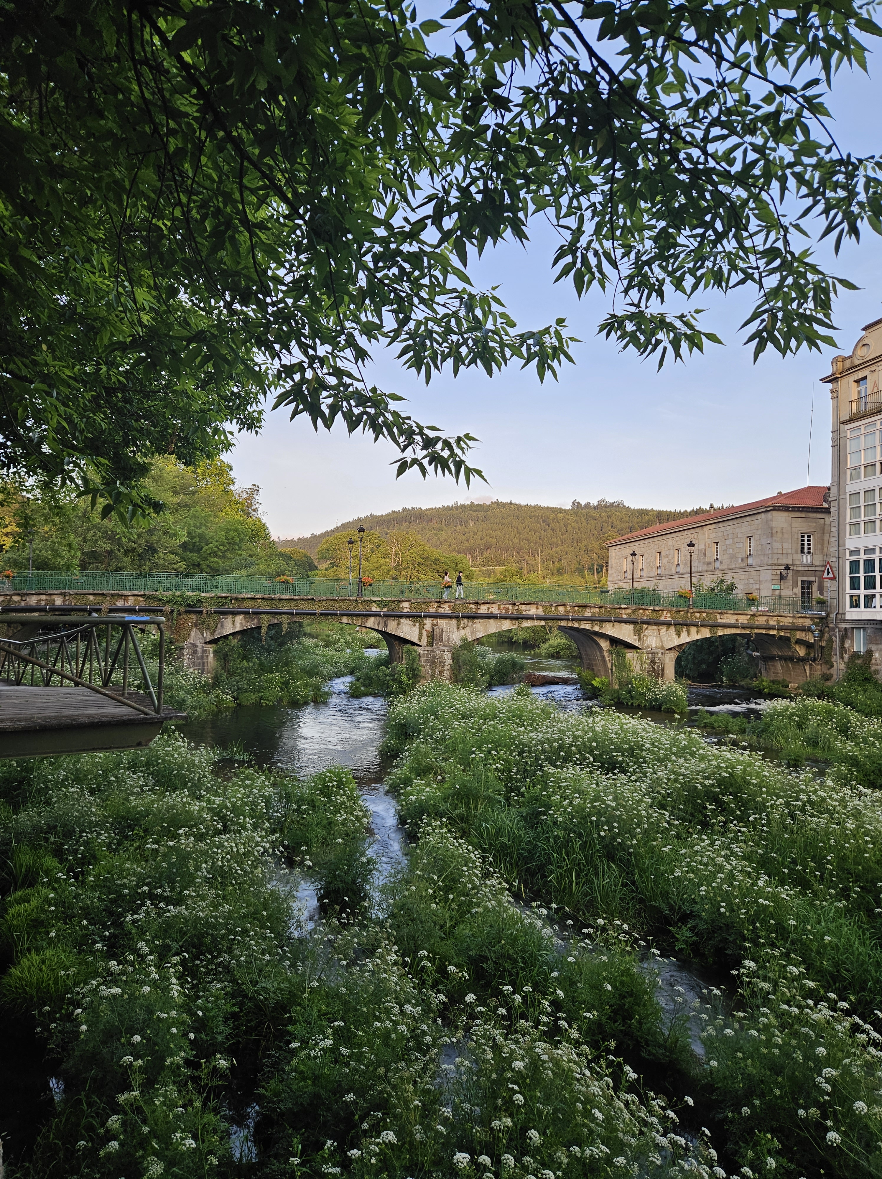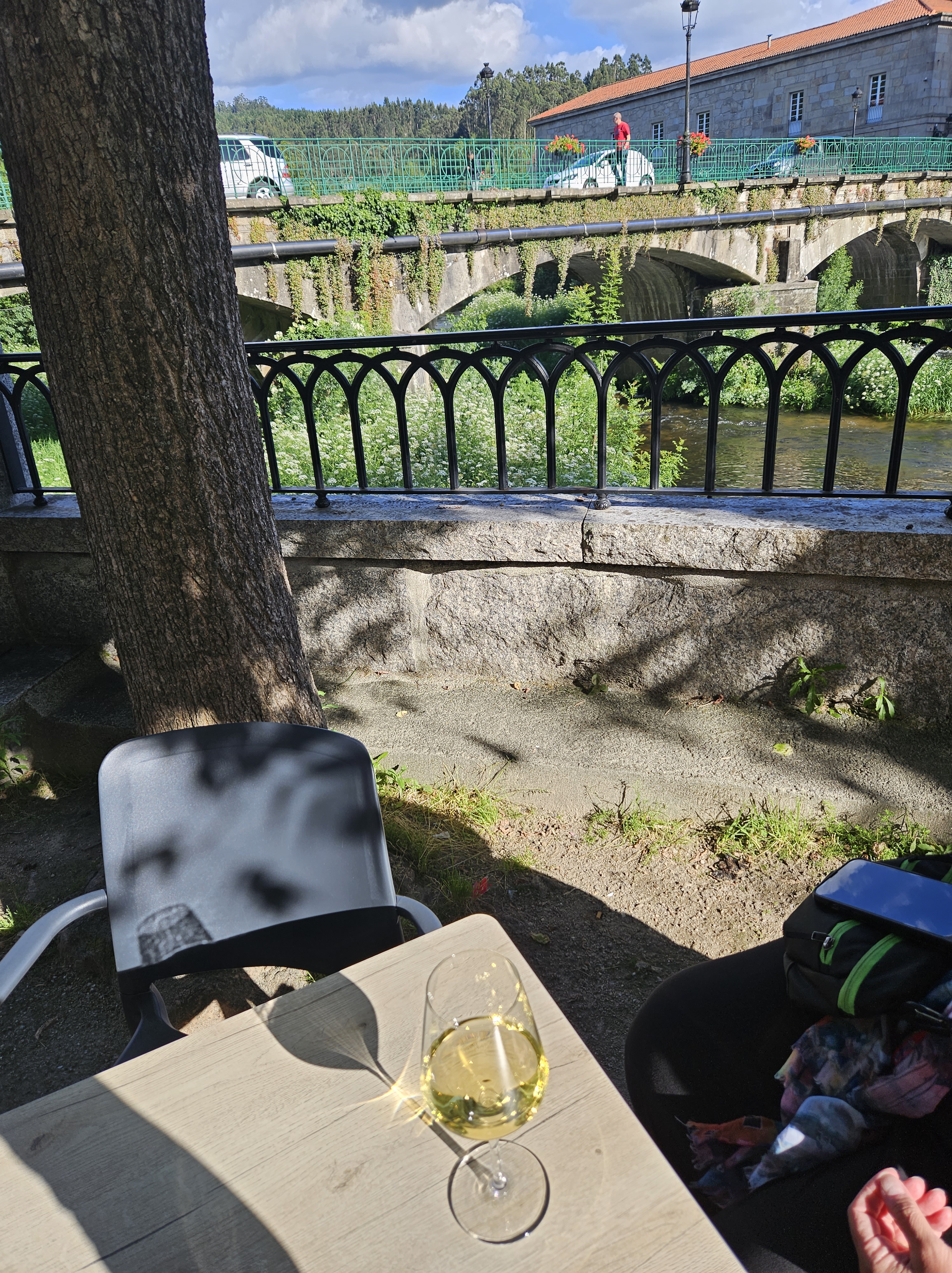 Our new friends found their accommodation right before the bridge over to Caldas itself, so we made plans to meet up for a meal later. Nanci and I couldn’t check in until 3, so we aimed straight for the riverside bar we could see on the other side, with tables in the shade and a smattering of backpacks around most of them. It was a lovely place to enjoy an anchor drink, though as we sat down, they were preparing to close until the evening. So we moved sluggishly on up the main street, found our accommodation – and discovered that we had to go even further up the street to check in and get our key. Oh well, that meant we’d seen most of the small town already.