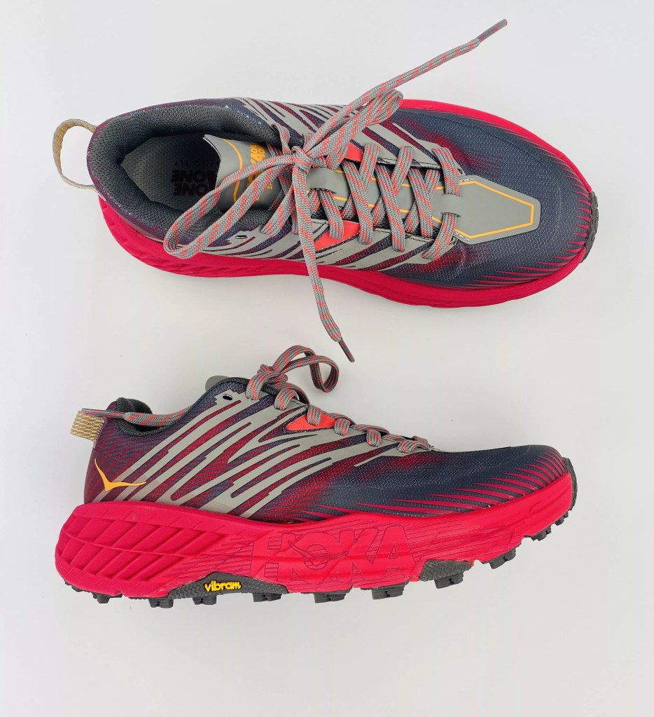 - Hoka Speedgoat trail runners with thick cushioning and durable Vibram sole, not waterproof because waterproof shoes can take a long time to dry