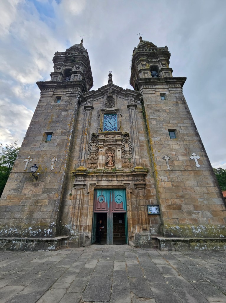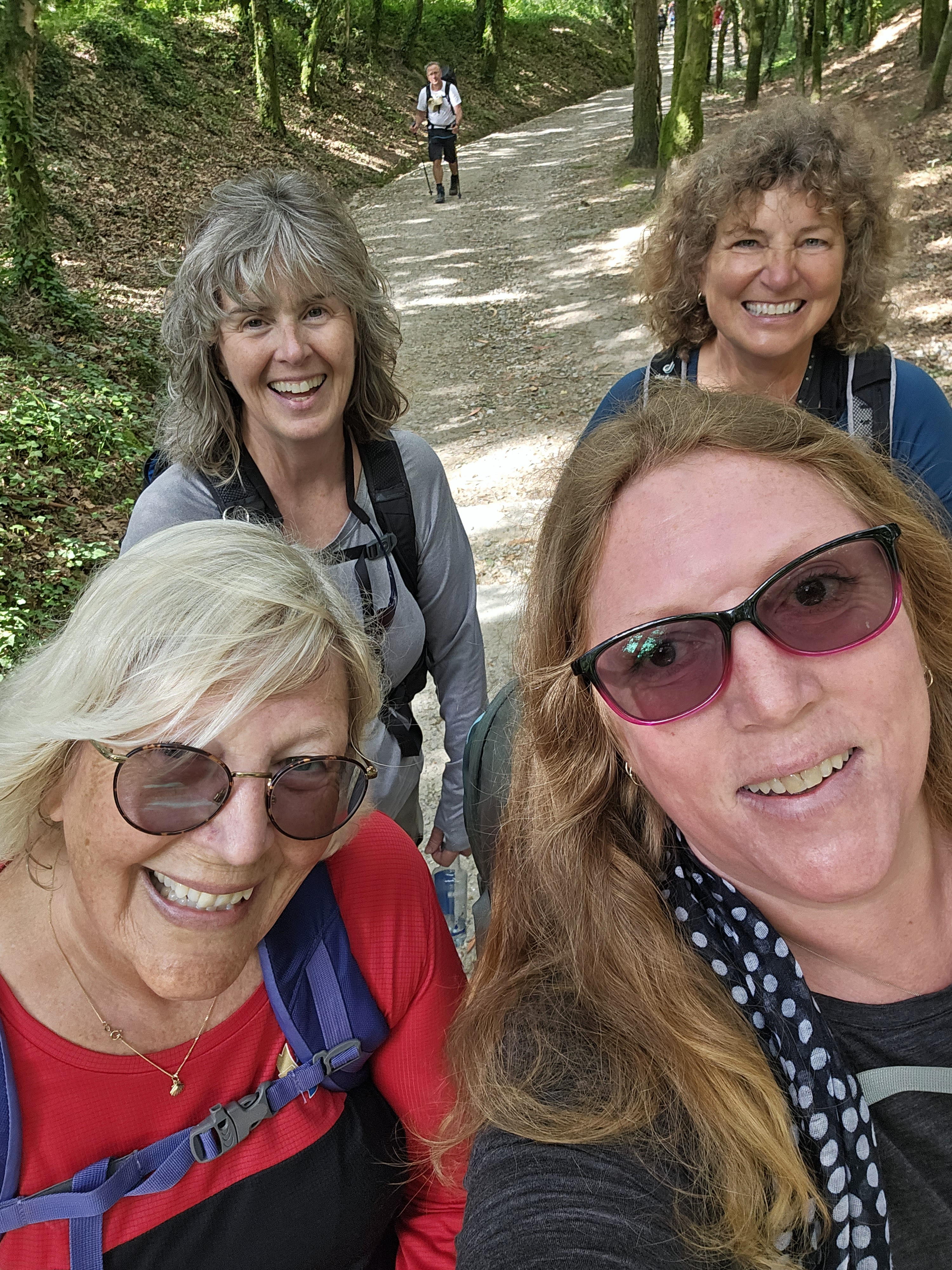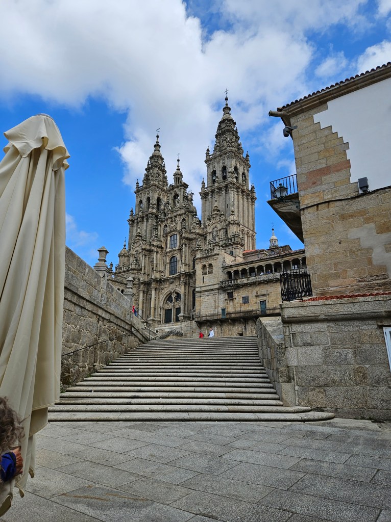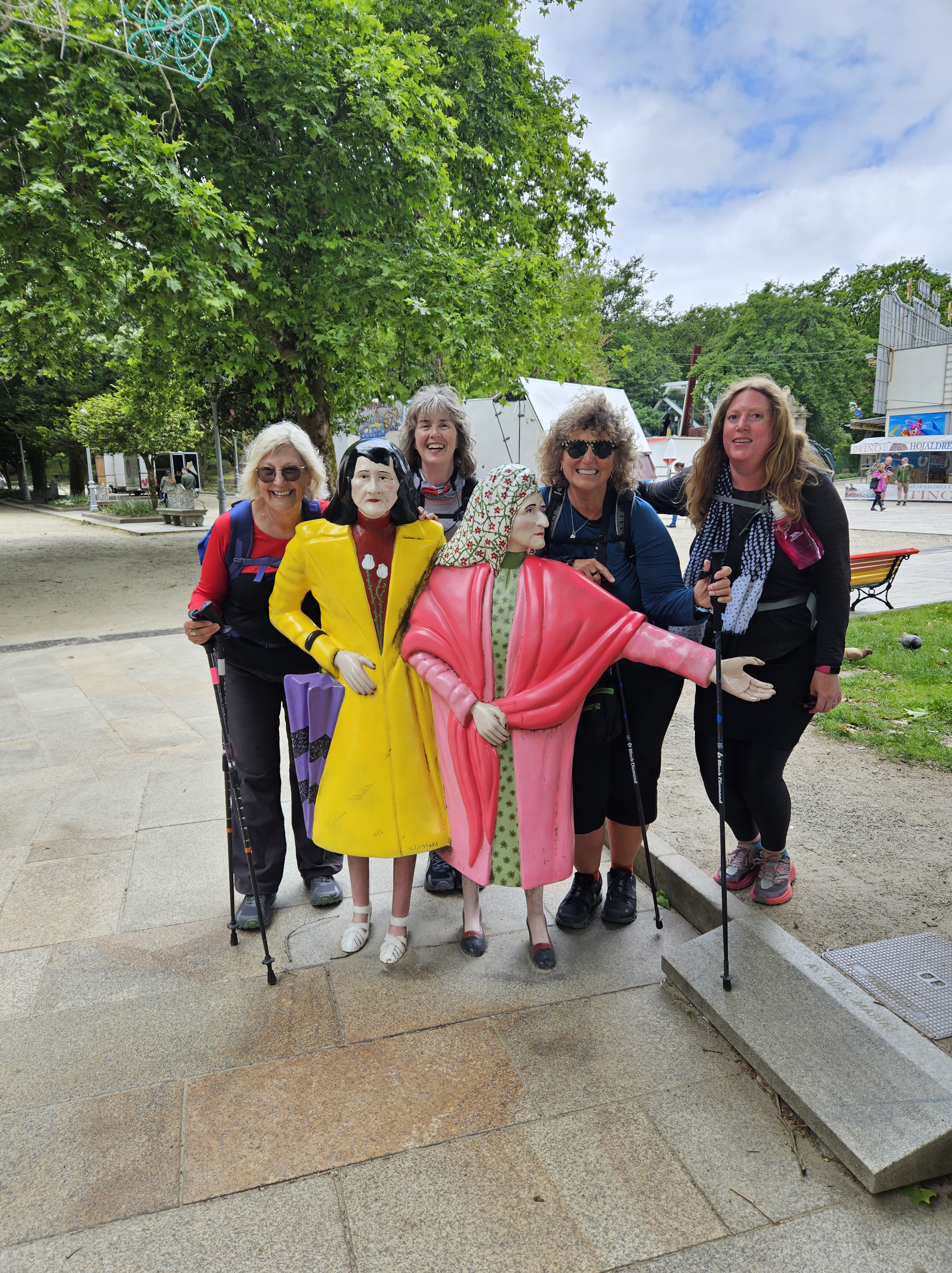 I realised we would enter Santiago old town via the plaza outside the Alameda park, so I was happy to introduce the ladies to the Marias, who stand proudly people watching in their colourful outfits. I had told them the story, so we had to do a group photo (yes, I am a lot taller and my knees hurt) taken by a random German couple who were fascinated by it. Then we crossed the last modern road and carried on into Santiago old town and the cathedral. The rain had thought better of stopping us by this point and we arrived with sunshine and blue skies.