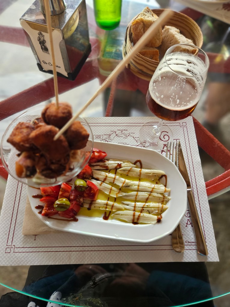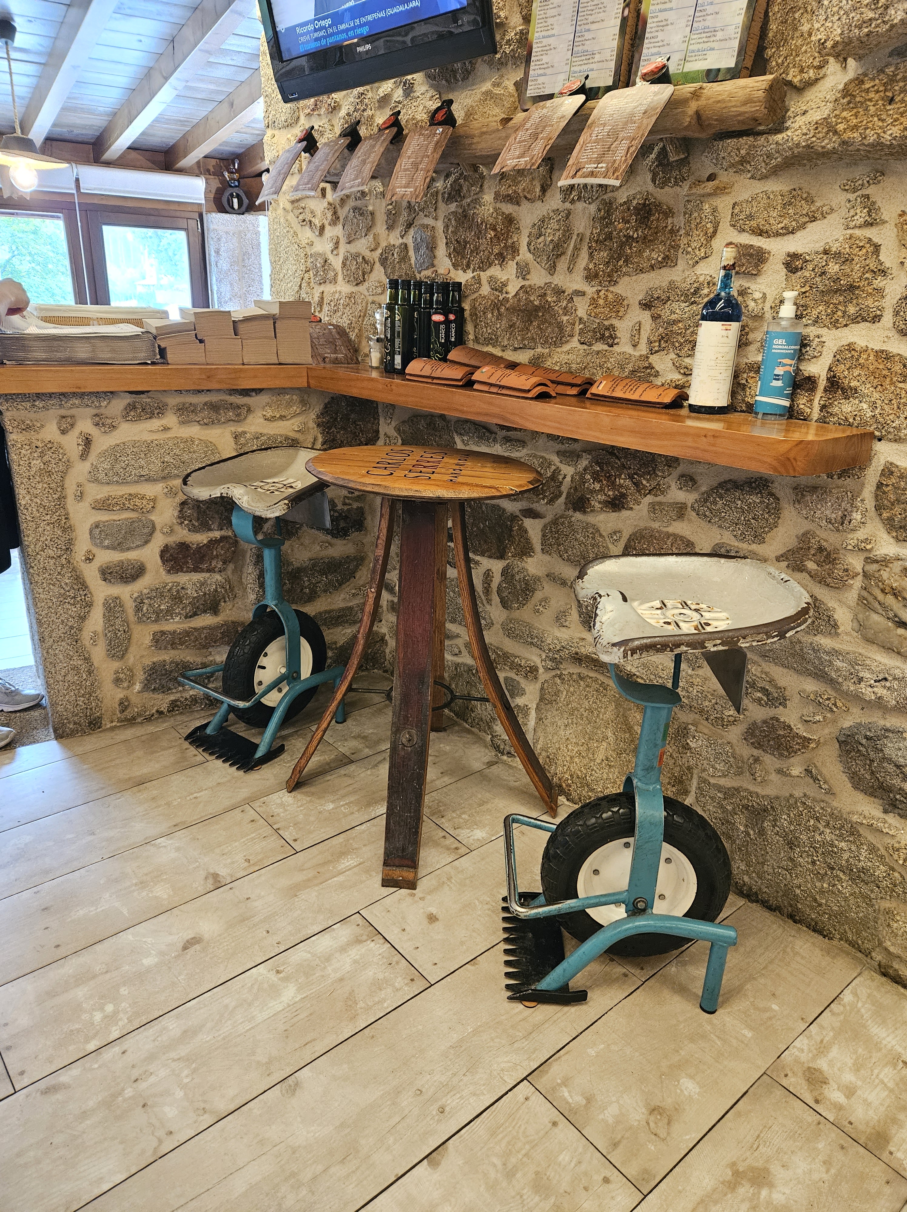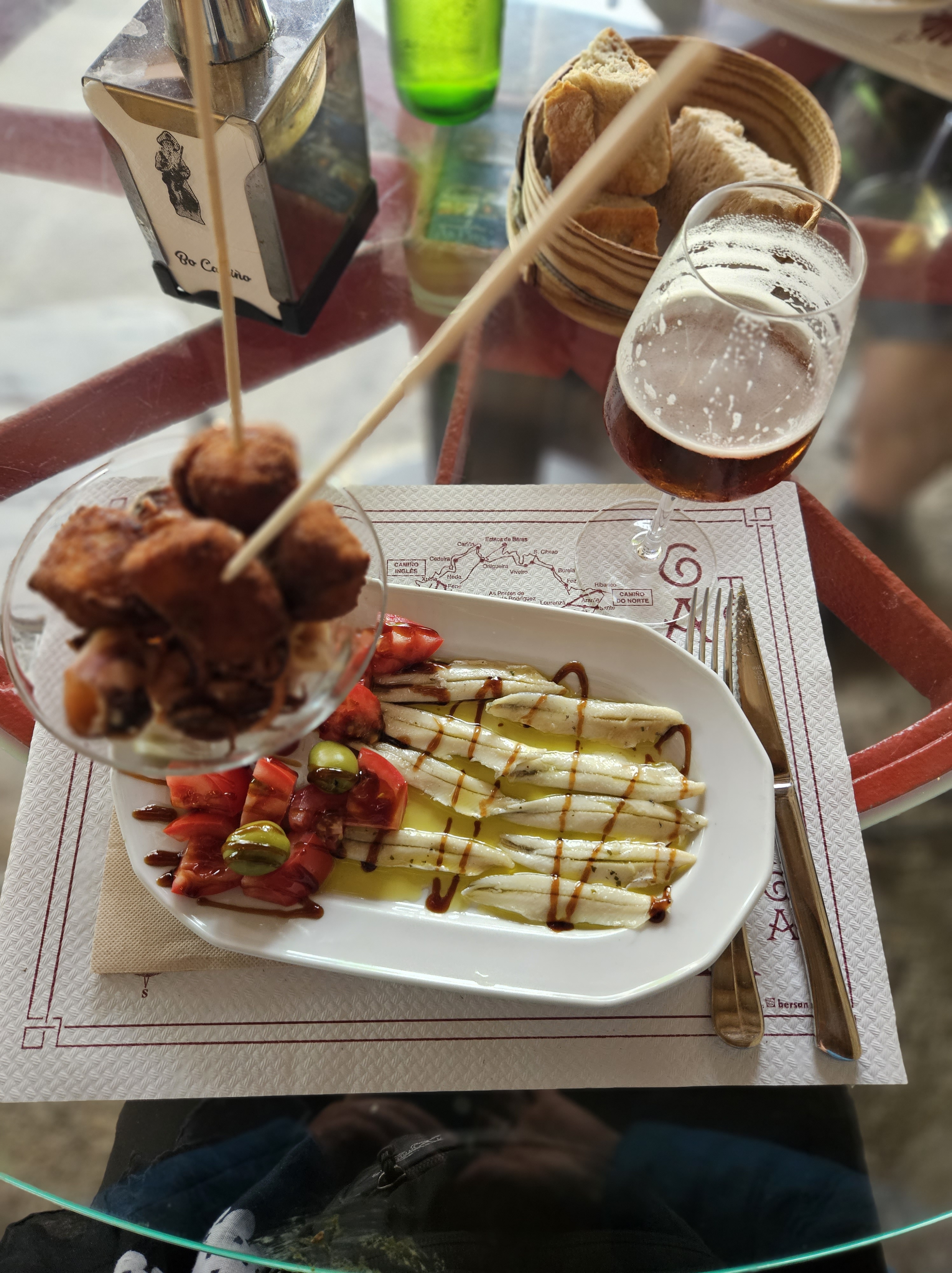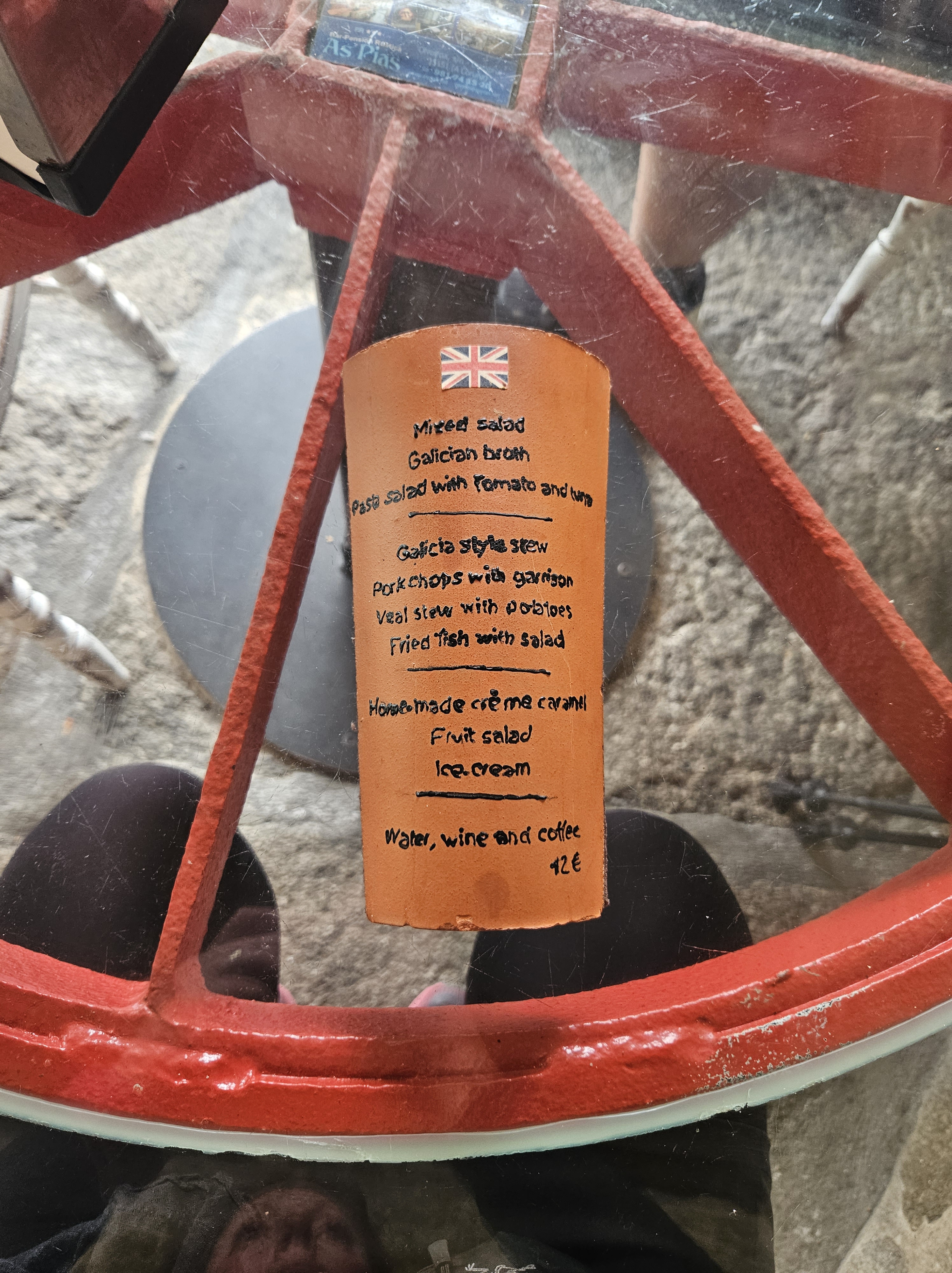 It tried to rain as we came closer to Olveiroa, so we decided it was time for some fancy lunch. Et voilĂ : We arrived at a very fun eatery – menu on roof tiles, bar furniture made out of agricultural bits and bobs, clearly a place where the locals came to eat, which is always a good sign. I asked the server to recommend something and he said everybody loved their bestseller, the surf and turf. When it arrived it was essentially a plate of anchovy fillets marinated in oil and vinegar, some tomato and olive salad, and a cocktail glass with deep fried squid pieces … I’m assuming the salad was the turf? I ate what I could; Nanci had a steak, I had steak envy. The beer was nice though.