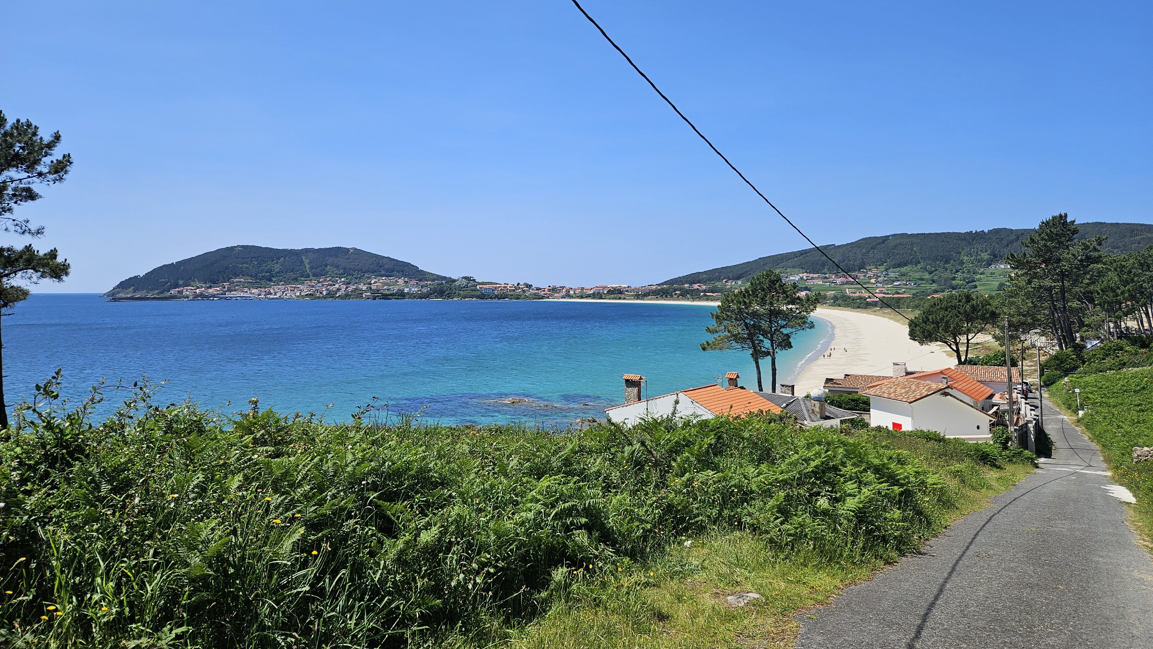 From there the path carried on through populated areas and shady forests, up and down steep hills and across busy roads. Then, finally, we emerged on Langosteira beach and could see the town just beyond the sweep of sand, with the headland, the westernmost point, rising just behind it.
