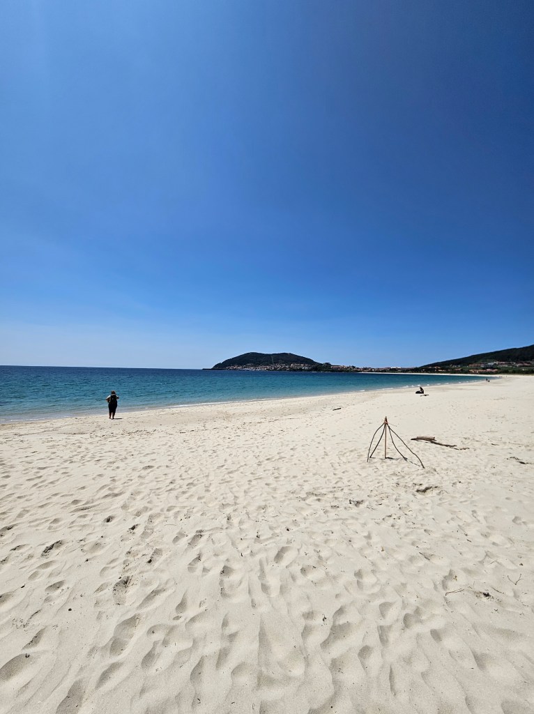 I was most disappointed to find that the tiny bar just as you come out of the woods and enter the beach, was gone! it was now just a circular stone platform with some edges to sit on. So rather than stopping there, we took our shoes off and walked towards Fisterra along the water’s edge, paddling and picking shells and just enjoying the moment with no hurry in the world.