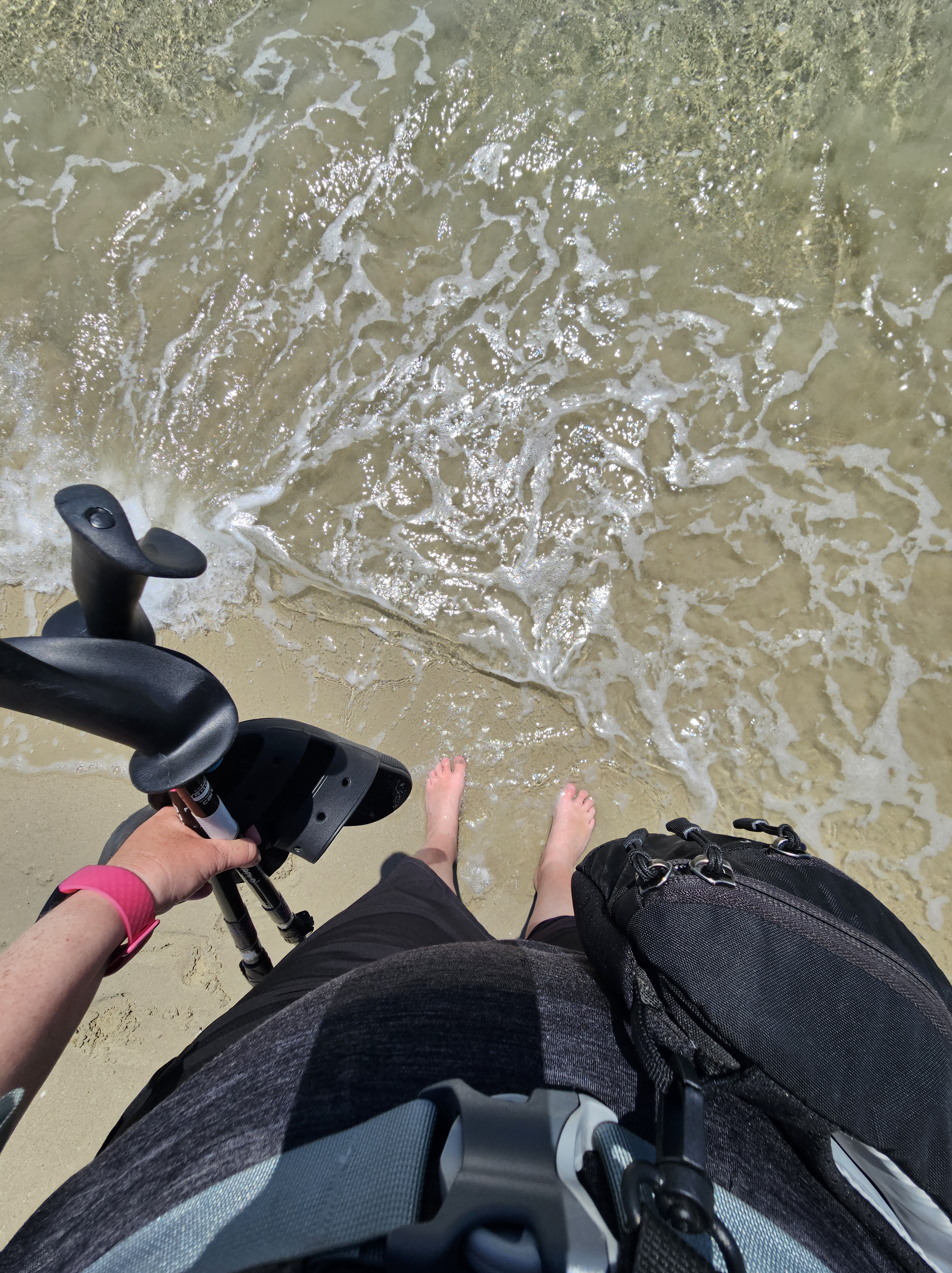 We stopped for a snack and a paddle at Estorde beach, the best ever lunch stop. While we had our Aquarius, the people from the boat in the photo jumped in with their two dogs and swam ashore to play on the beach. Pilgrims from the bar just before ours did a mass run-in, splashing and squealing, and posed for endless smiling selfies. Nanci had a paddle in the sunshine and looked for shells. I could have sat there for hours, perfectly content.