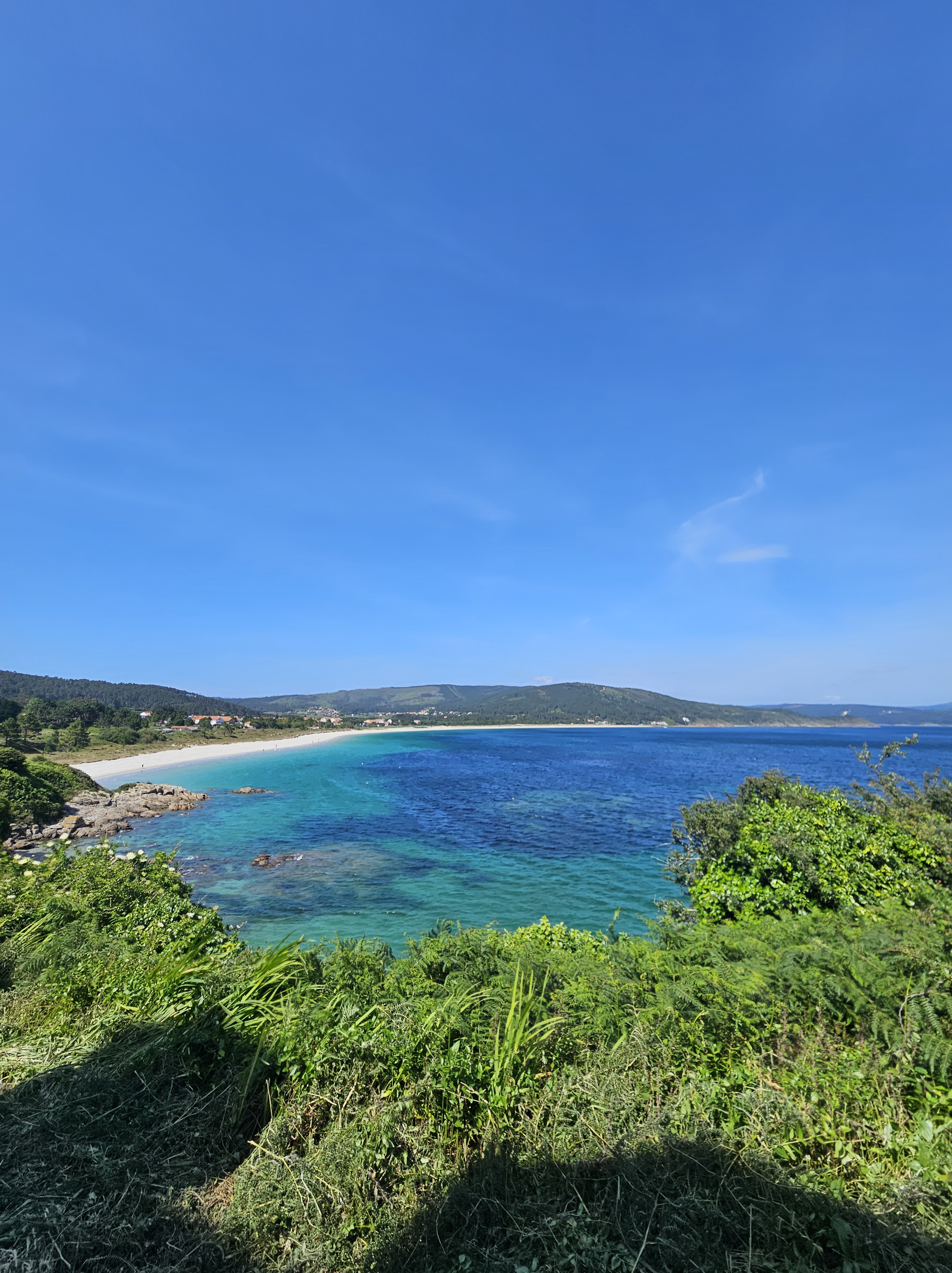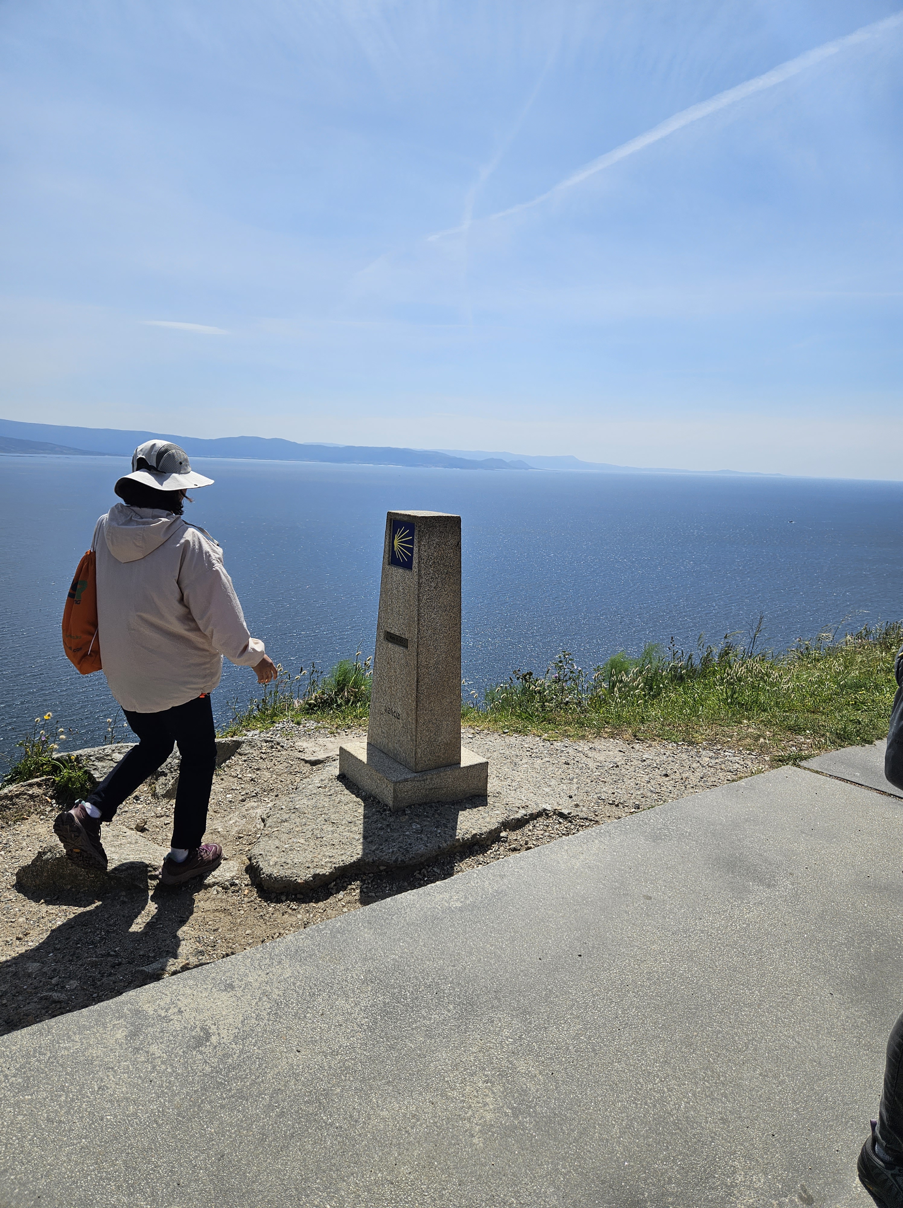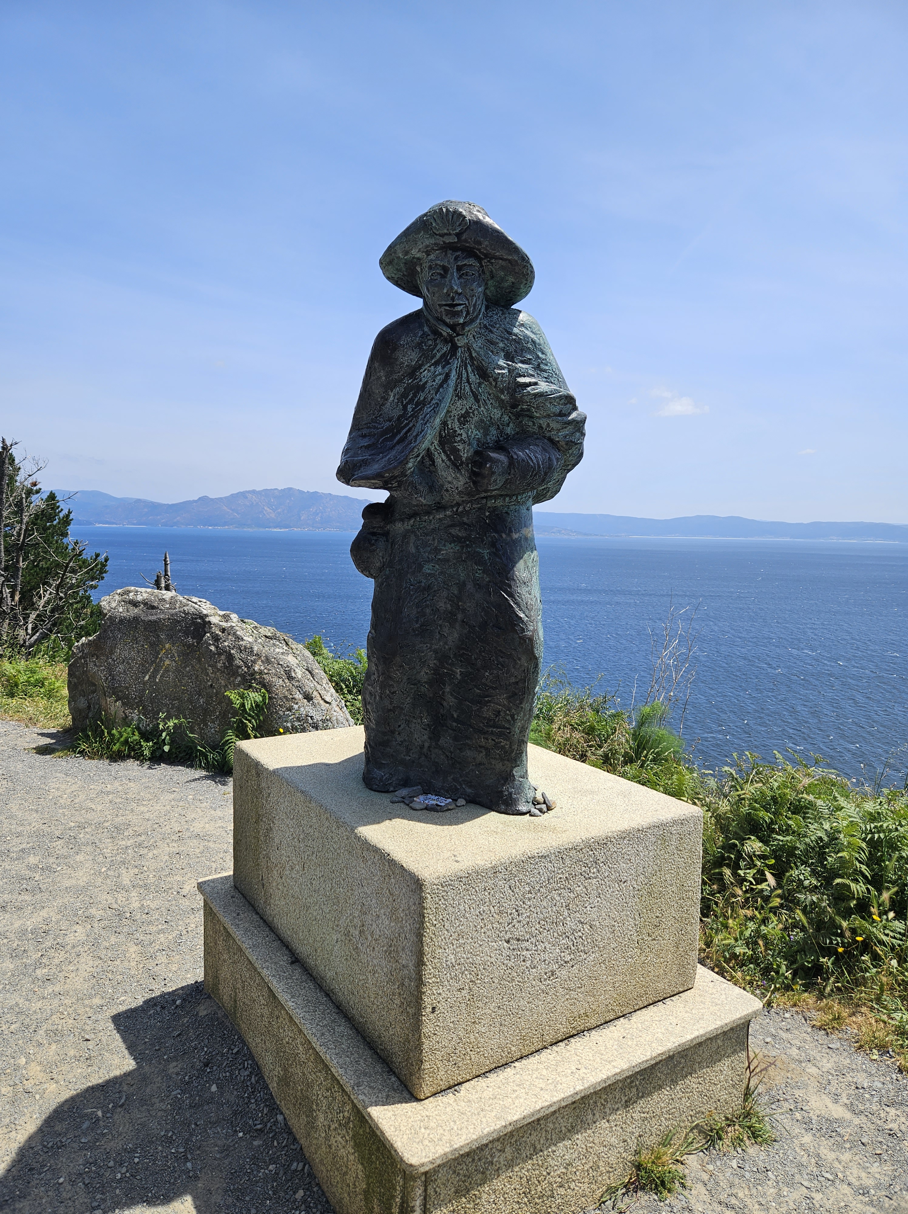 As our rest day in Fisterra was getting on, we went back to the Langosteira beach to look for the perfect camino shell and for Nanci to have a swim in the calm, cool water. Sadly we found no good scallop shells, only pieces of them. Either they get picked as soon as they wash ashore, or this simply isn’t a good place to find them. Nanci did have her dip in the sea though, while I sat in the sand just enjoying the heat of the day, and giggled at the man trying to encourage Nanci to duck under. He had no idea he was talking to a Californian beach lover.