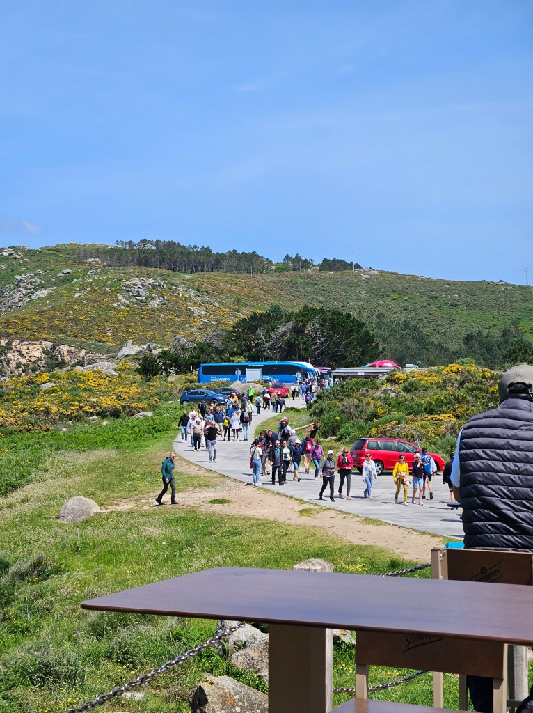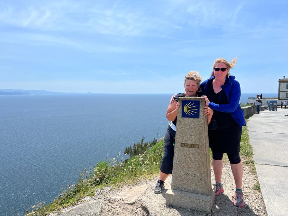 Then as we were leaving, the queue for the 0 km marker had suddenly dwindled, and Nanci asked a random pilgrim to take her photo. I felt like such a useless travelling companion – surely I should be able to take her photo, if I just didn’t look down? But still I hesitated. As the random pilgrim photographed Nanci, I suddenly surprised myself by asking if she could take a photo of both of us? Nanci grabbed the marker to create a safe, solid barrier between me and the drop, and I went carefully over to the edge. And then, finally, awkwardly, I had my photo taken at the End of the World! Thank you, Nanci!