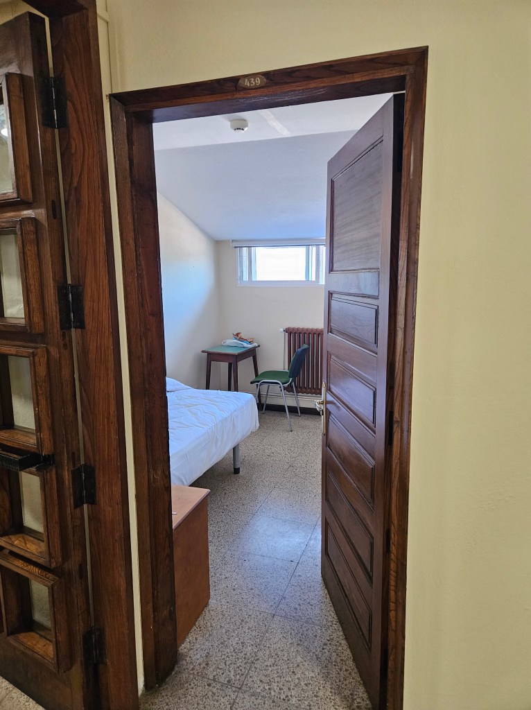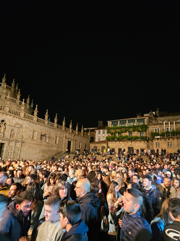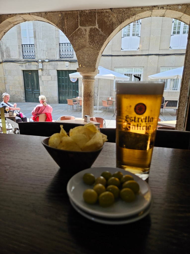 The taxi driver took us to Corcubion and handed us over to his wife, who was also a taxi driver, and she drove us quickly and comfortably to Santiago. We went straight to the Pinario, where we had booked two single rooms and the Beast was waiting for us. Nanci was feeling a bit peaky and needed to lie down, so reception took pity on her and managed to find a room and check her in before time. I left my bag there and went out to buy some medicines and food and drinks for her – yogurt, said the lady in the farmacia, and green apples, and bananas, and rice cakes, and lots of water and Aquarius. After I had delivered the goodies, I checked into my own very basic room and left Nanci to rest up and sleep.