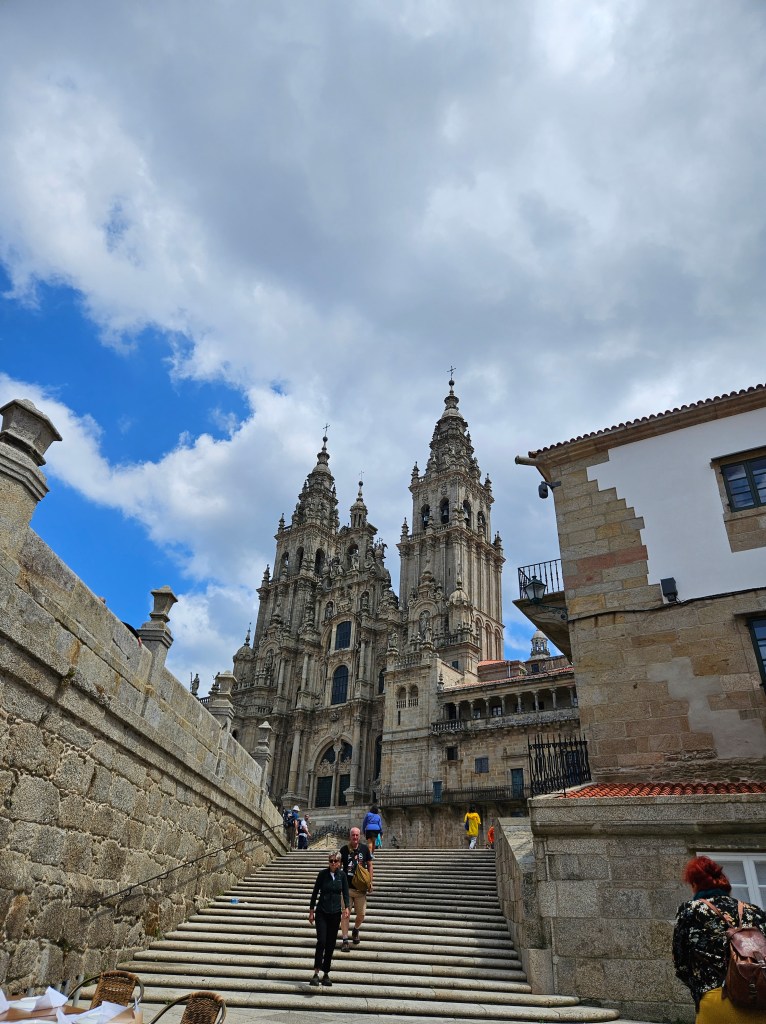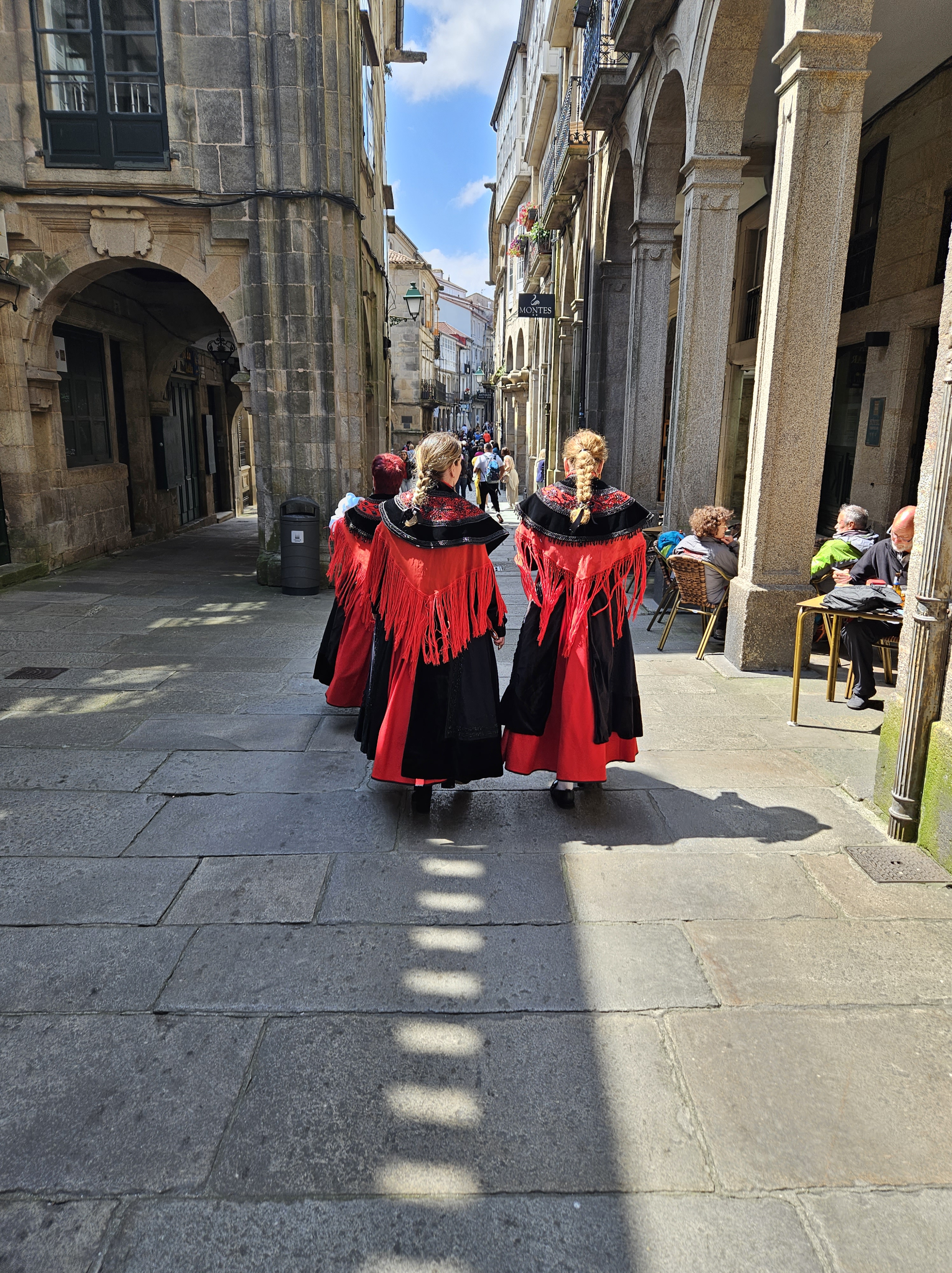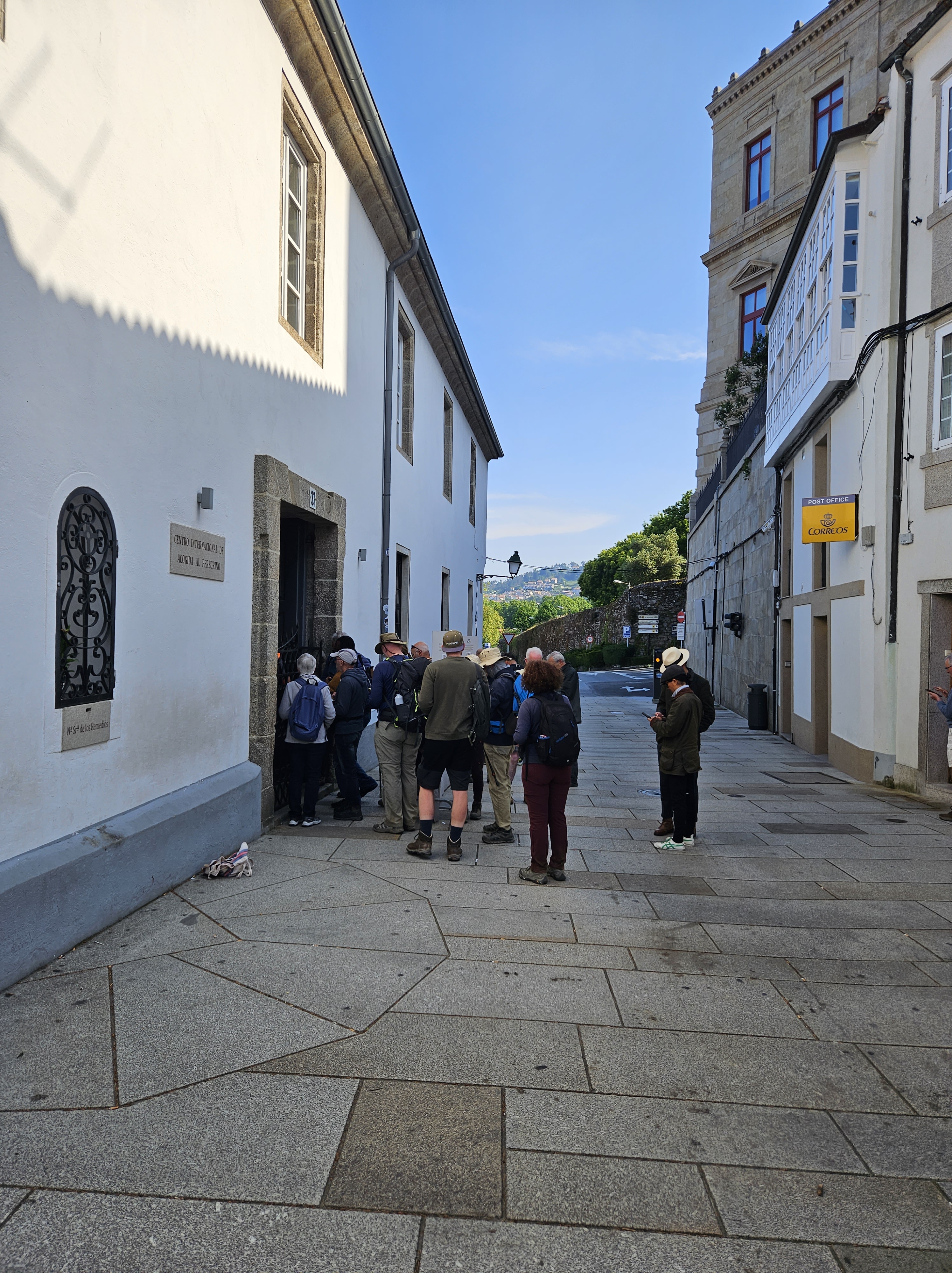 Incredibly, the next day Nanci managed to do all the magic for the Compostela on her phone before we went down to the office. There was some confusion outside, pilgrims saying they couldn’t get the new online registration system to work, but Nanci showed her QR code and immediately got whisked through – and ten minutes later she was back out with her scroll! She still wasn’t feeling right, but she came for a coffee with me in the sunshine. She also wanted to see the mass and the botafumeiro if she could, and went to the cathedral to line up, but sadly the queue was just too long. So we did a little souvenir shopping and tried the Japanese restaurant for lunch before she went back to her room to rest. There was obviously something wrong, though we didn’t know what or how to fix it, we just had to hope that it would get better soon.