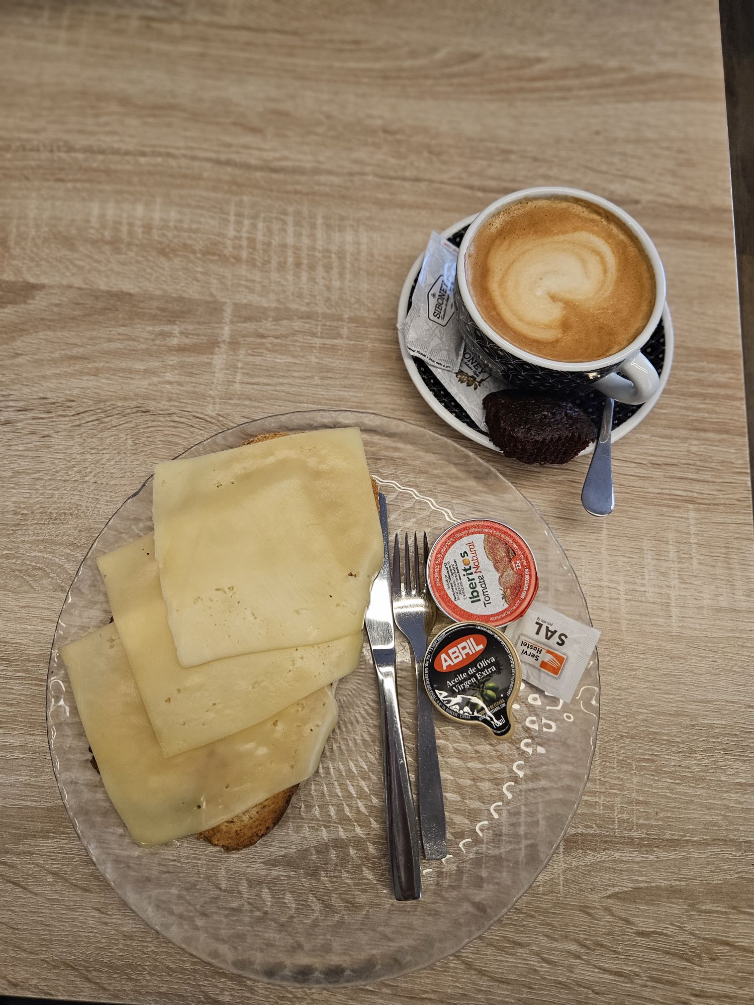 Oh, and stamps! It can be tricky to get enough sellos in the credencial when you walk short distances, so we nipped into the Municipal office for one. On the way out we almost collided with the British couple I had run into yesterday, first at lunch and then in the evening. and they told us that the cafe right by where we stood had toast with tomato pulp and olive oil, and even ham and cheese on top. Breakfast saved, we waved them off and went to eat.